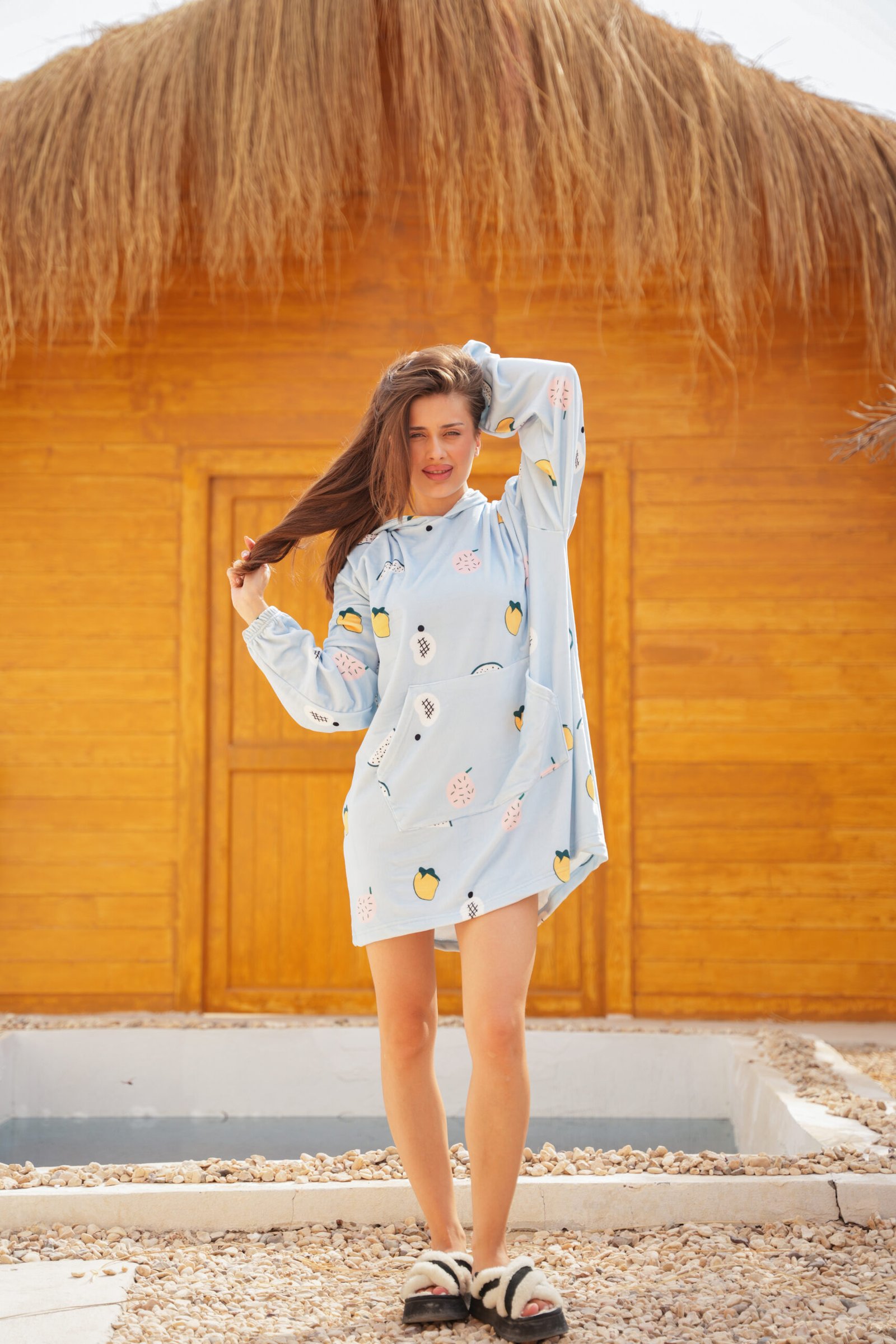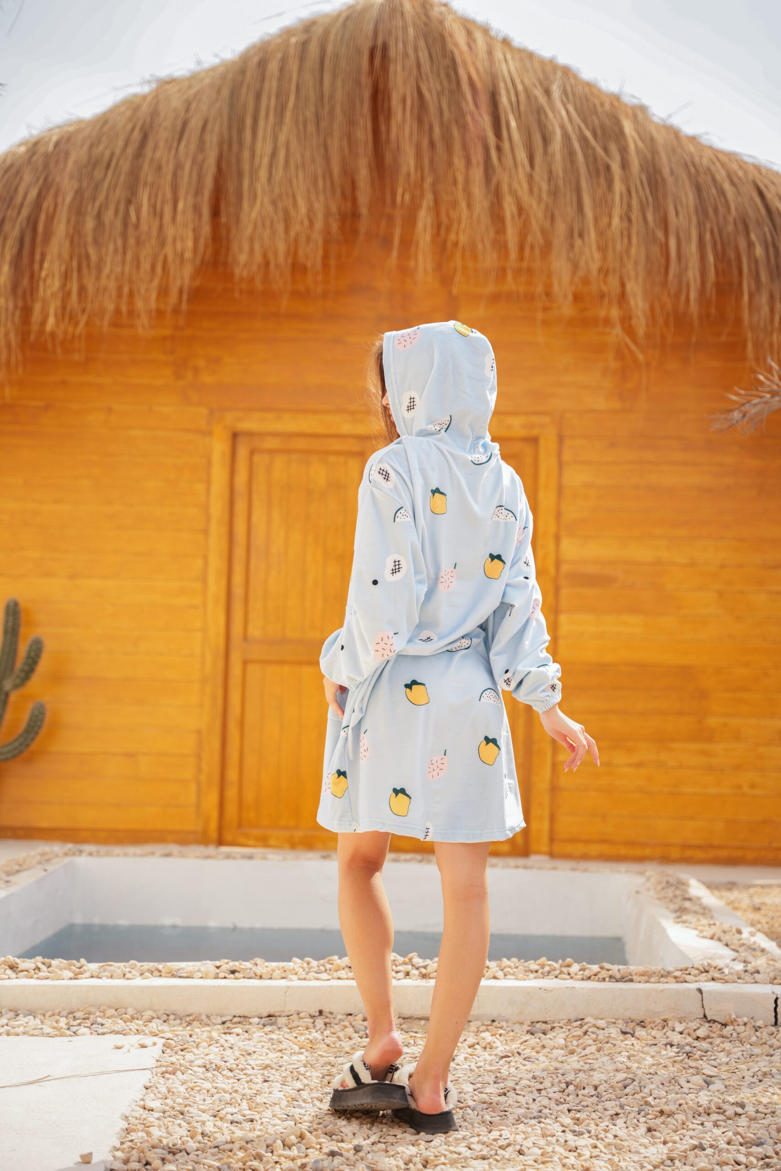 بلانكت هودي قطيفة مبطنة بلون أزرق باستيل هادي مع نقشة فاكهة لطيفة بتدي طاقة مبهجة وشكل بناتي جداً.