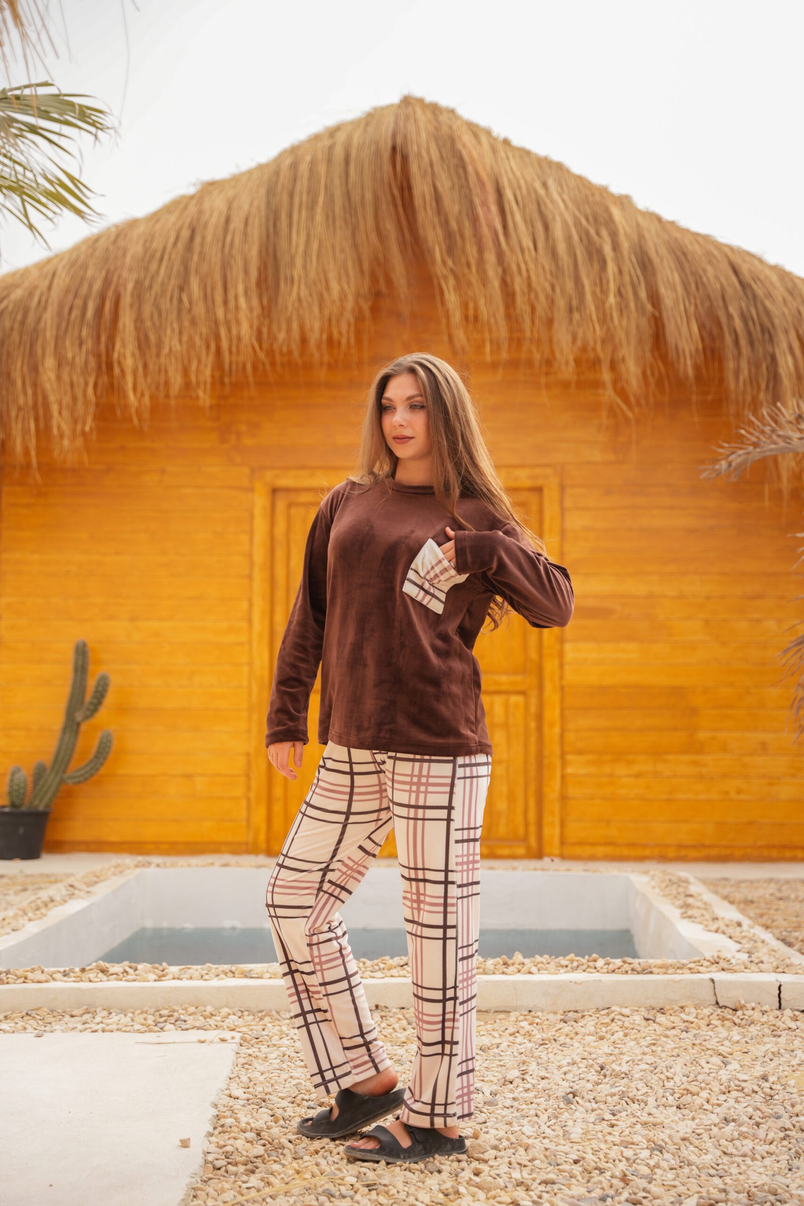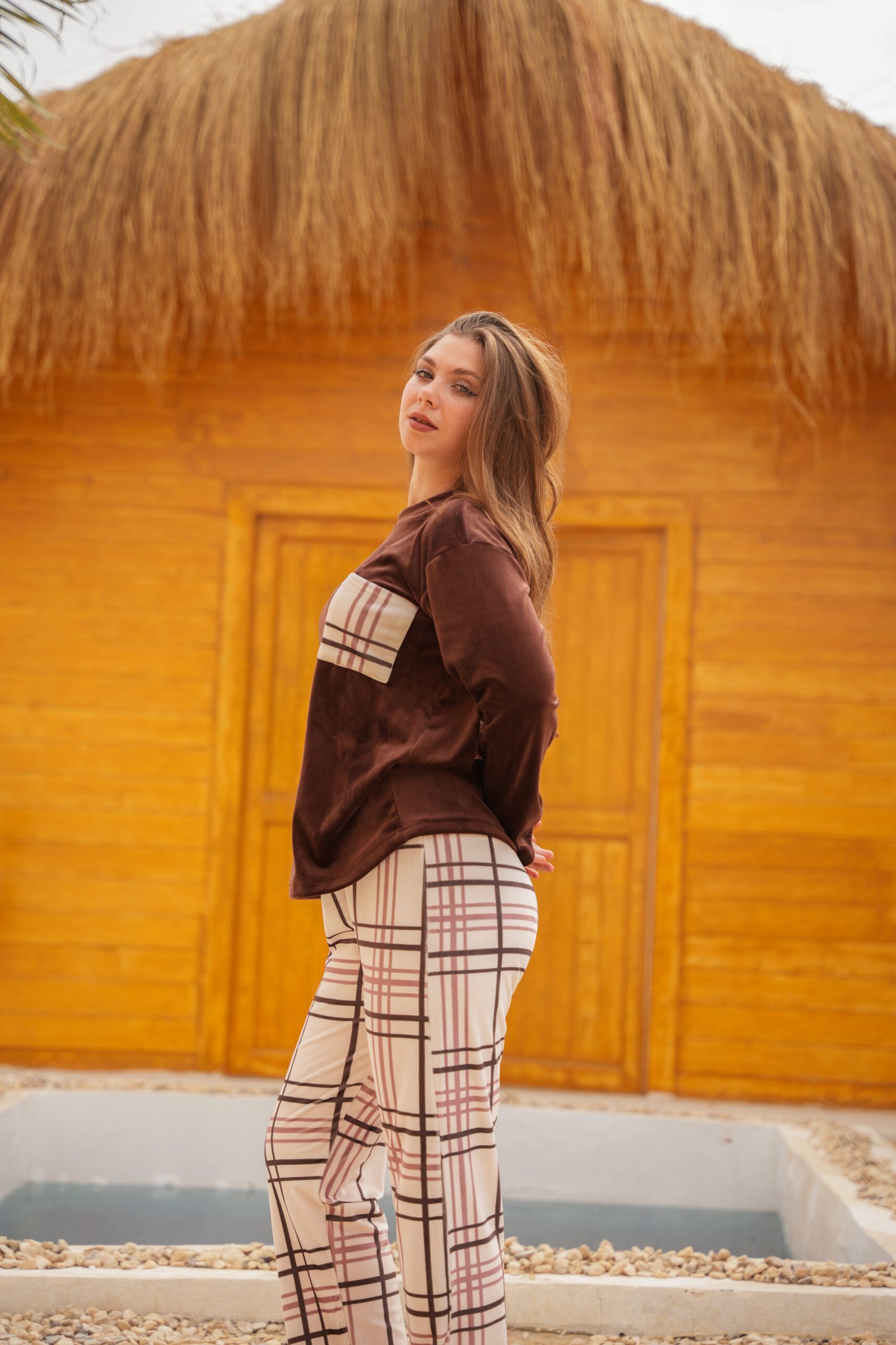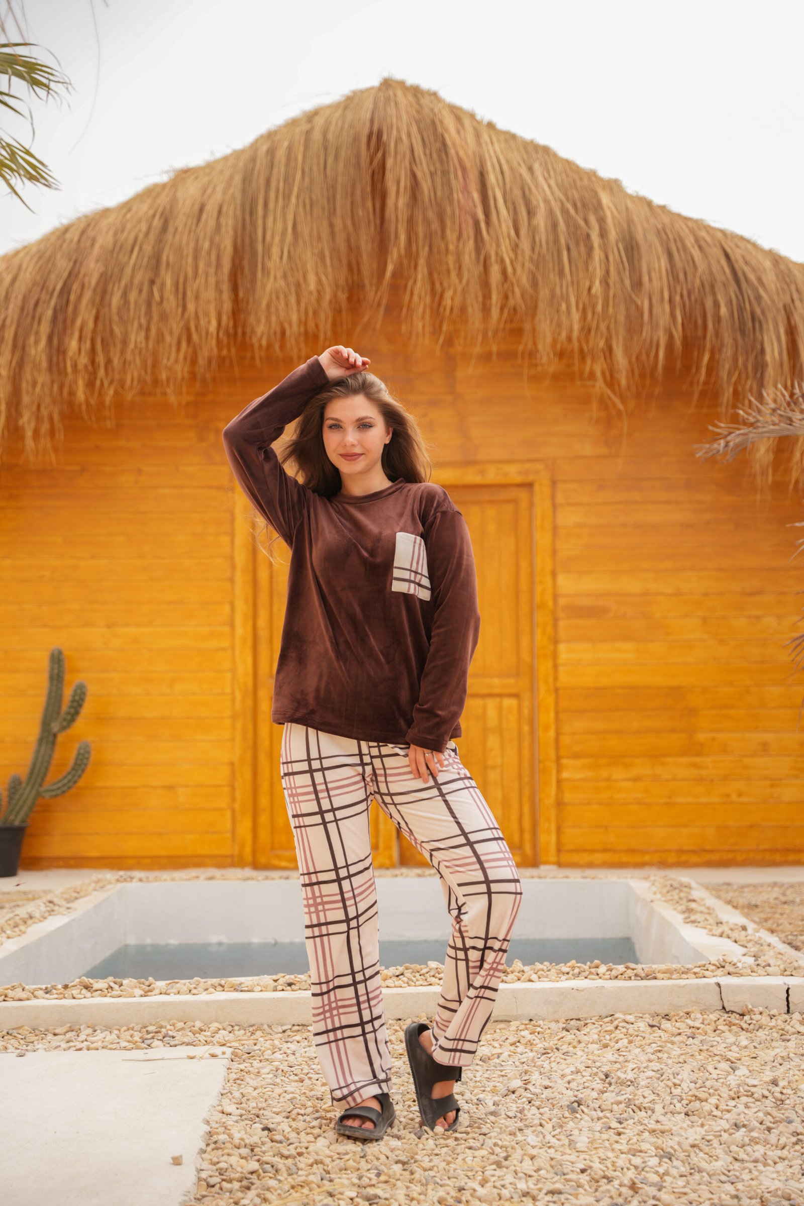 طقم مريح بخامة قطيفة ناعمة، تيشيرت بني سادة مع جيب برسمة كاروه تزيده شياكة، وبنطلون كاروه ألوانه هادية ومناسبة للشتا. طقم عملي للبيت وناعم على الجسم.