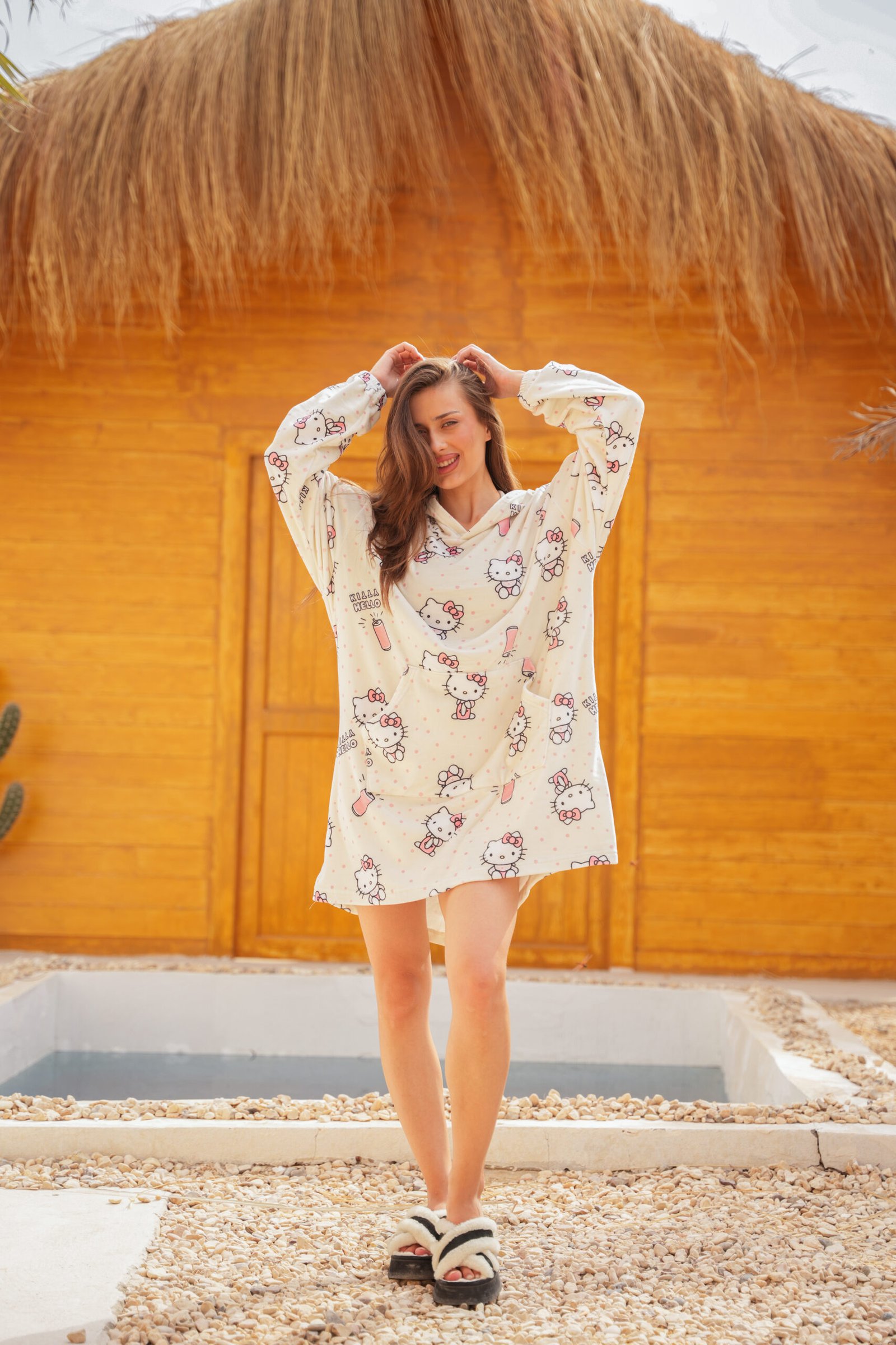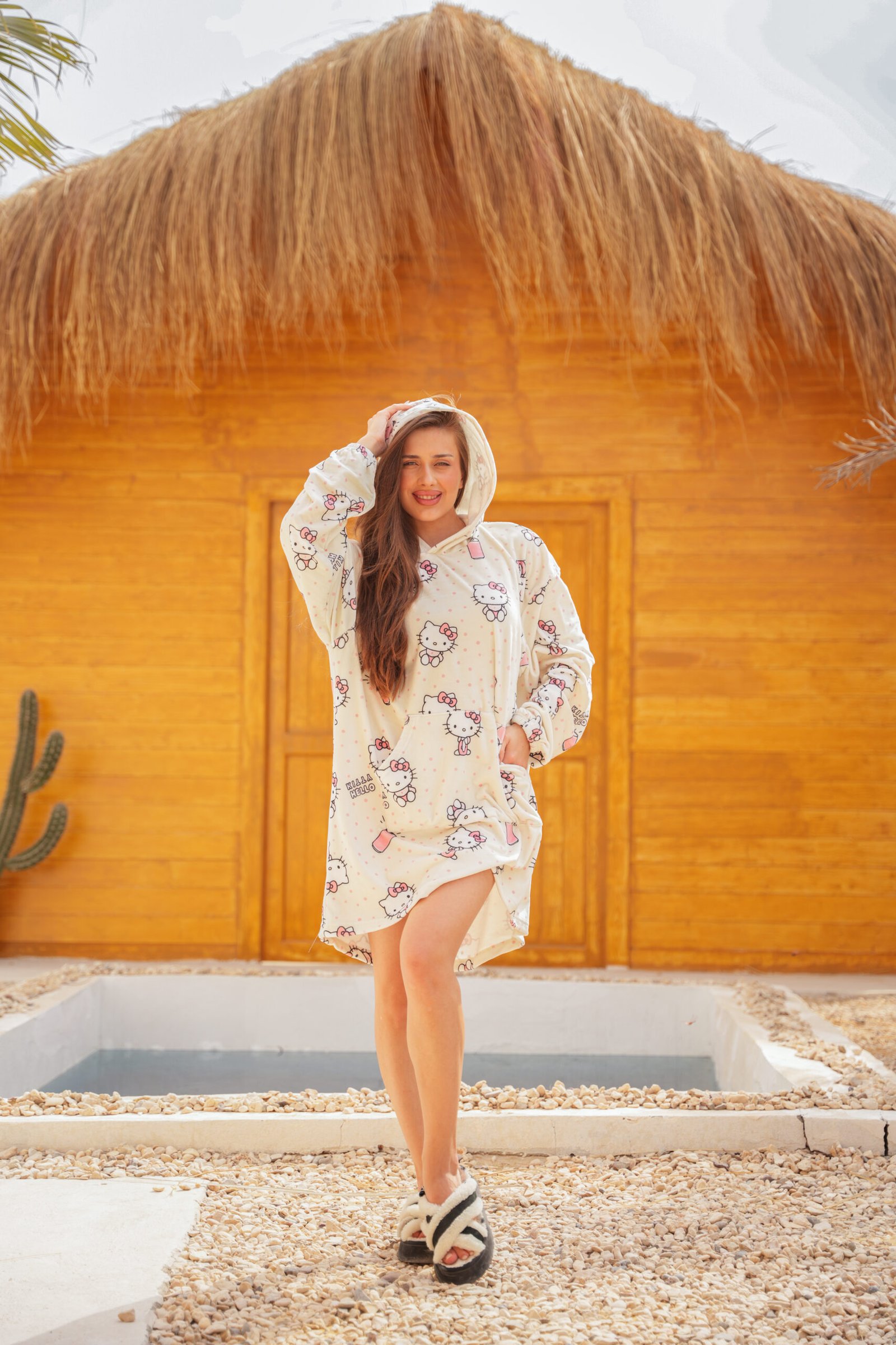 بلانكت هودي قطيفة مبطنة بستايل أوفر سايز واسع وناعم، باللون أوف وايت هادي مع نقشة كرتون لطيفة بشخصيات بناتي وCute جدًا.