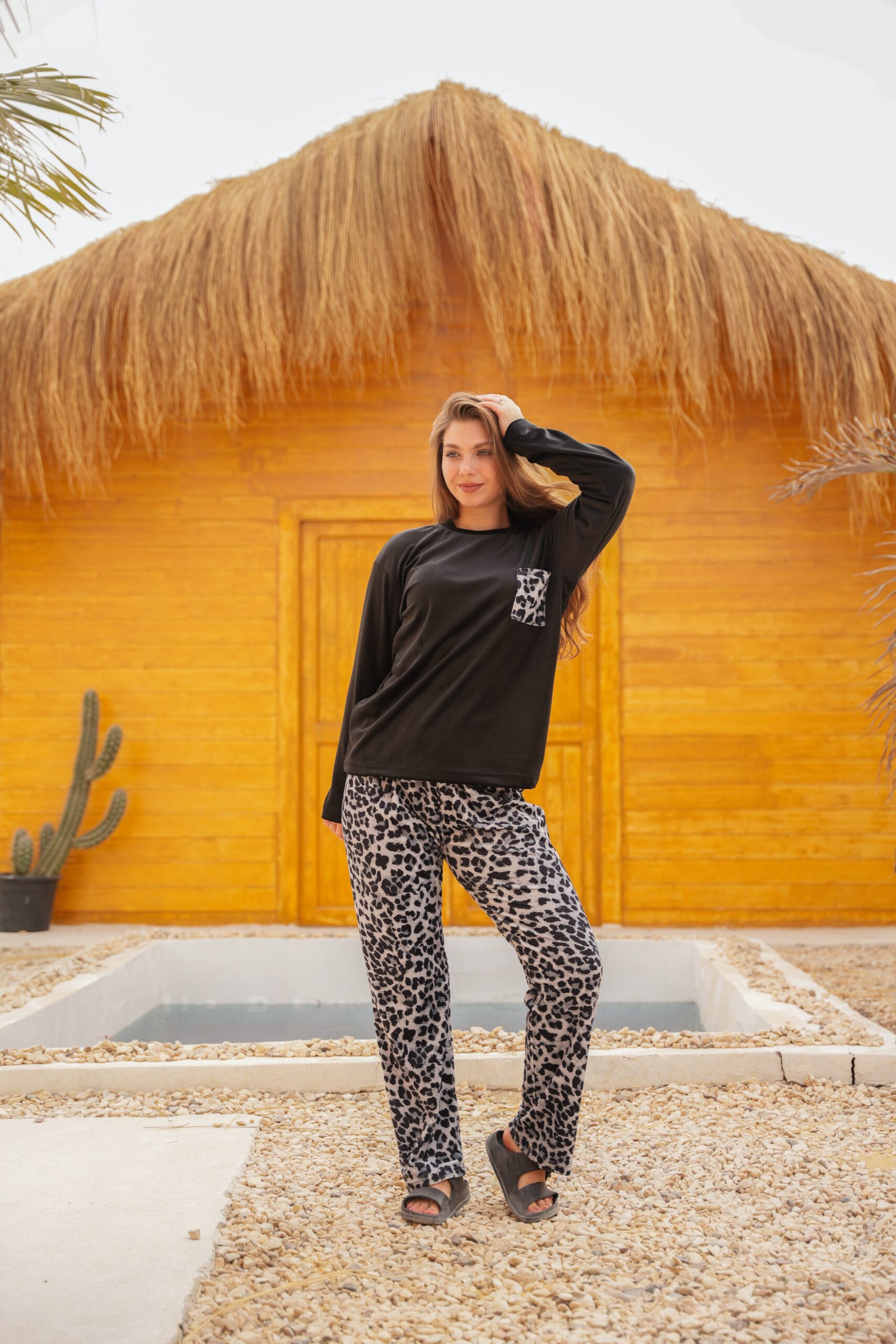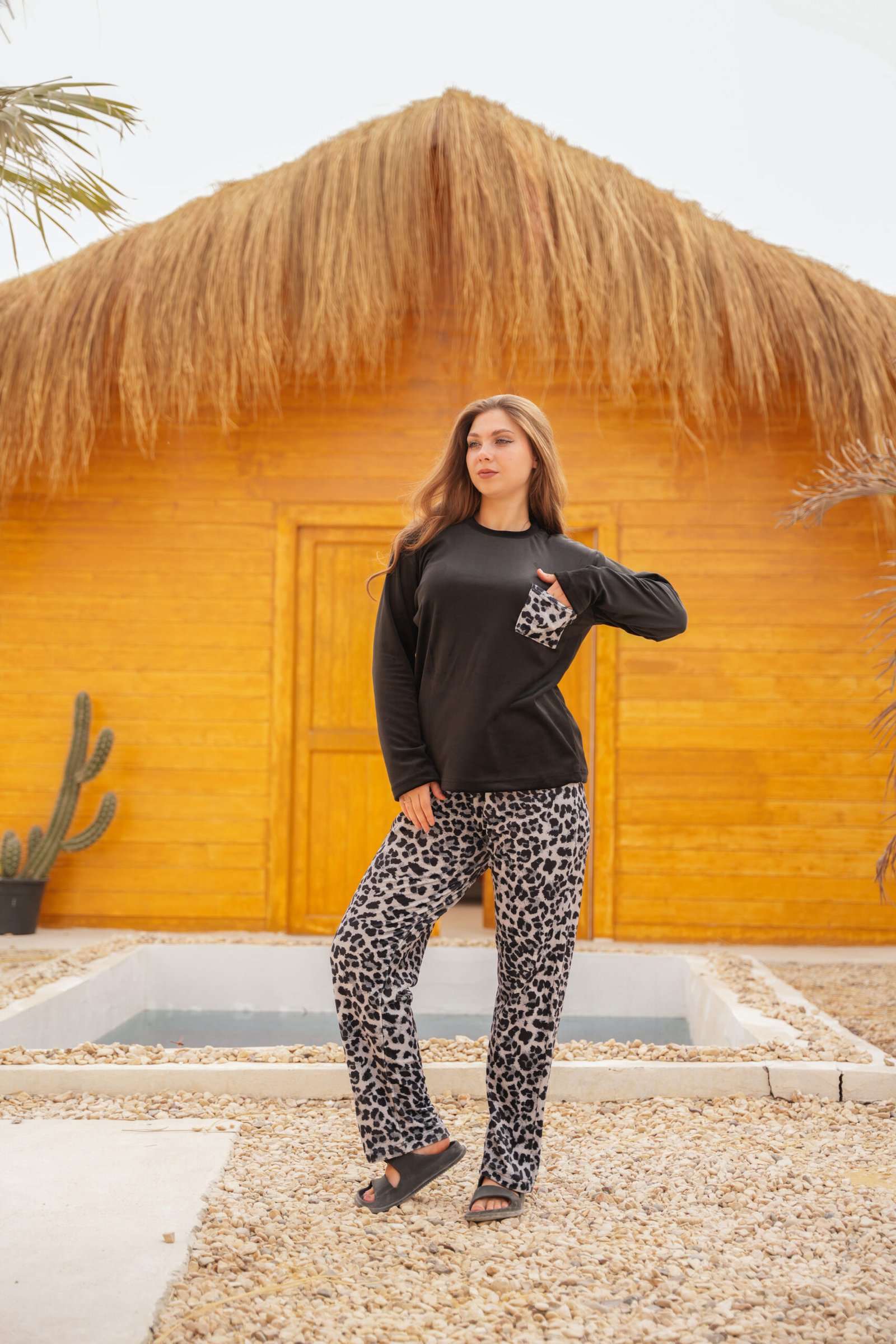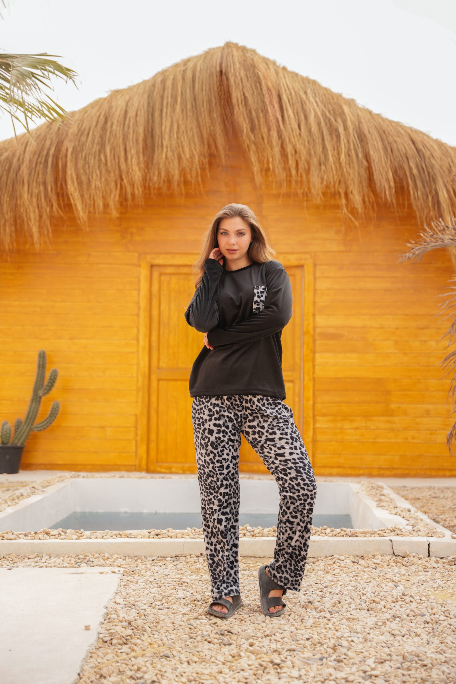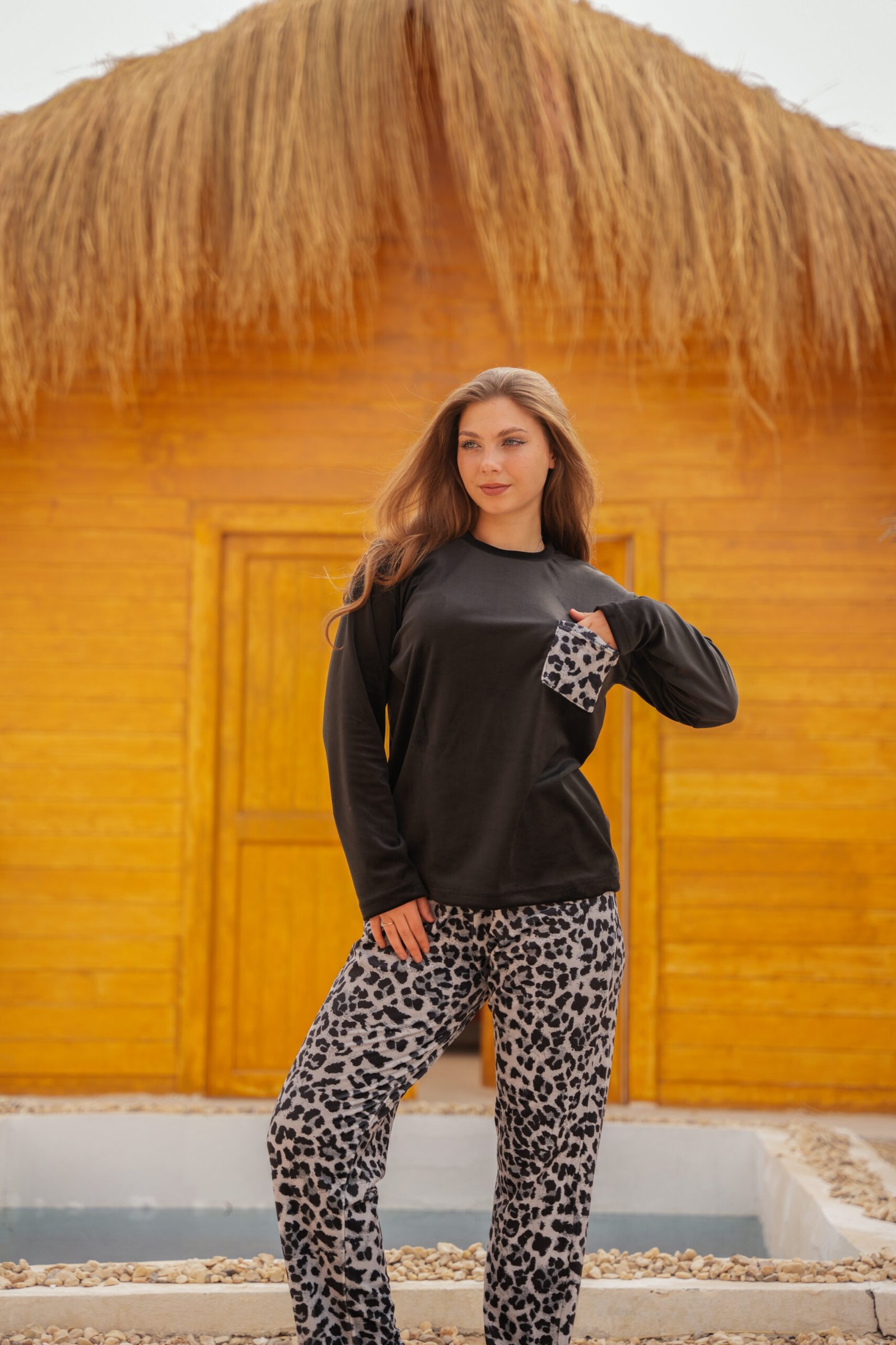 طقم شتوي ناعم بخامة قطيفة مريحة، تيشيرت أسود بجيب ليوبارد وبنطلون ليوبارد كامل لإطلالة جريئة ودافية في البيت. مناسب للشتا والخروج الخفيف.
