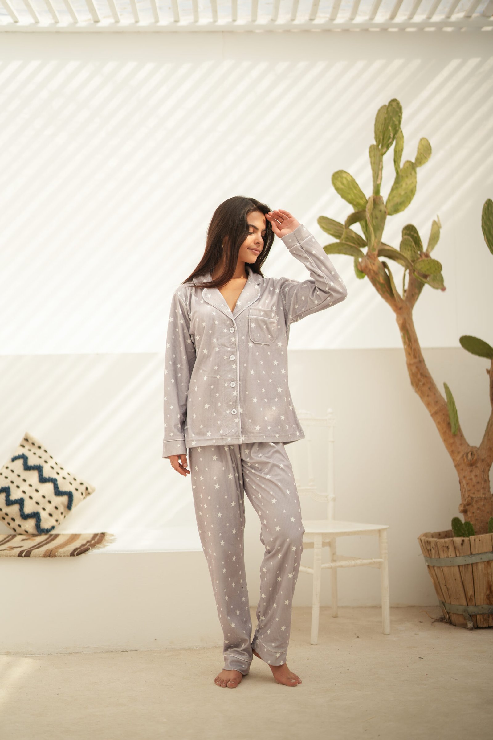 طقم قطيفة مضلّع بنقشة Stars رائعة، ناعم ويدفي، مناسب لليل الهادية والبيوت الدافئة.