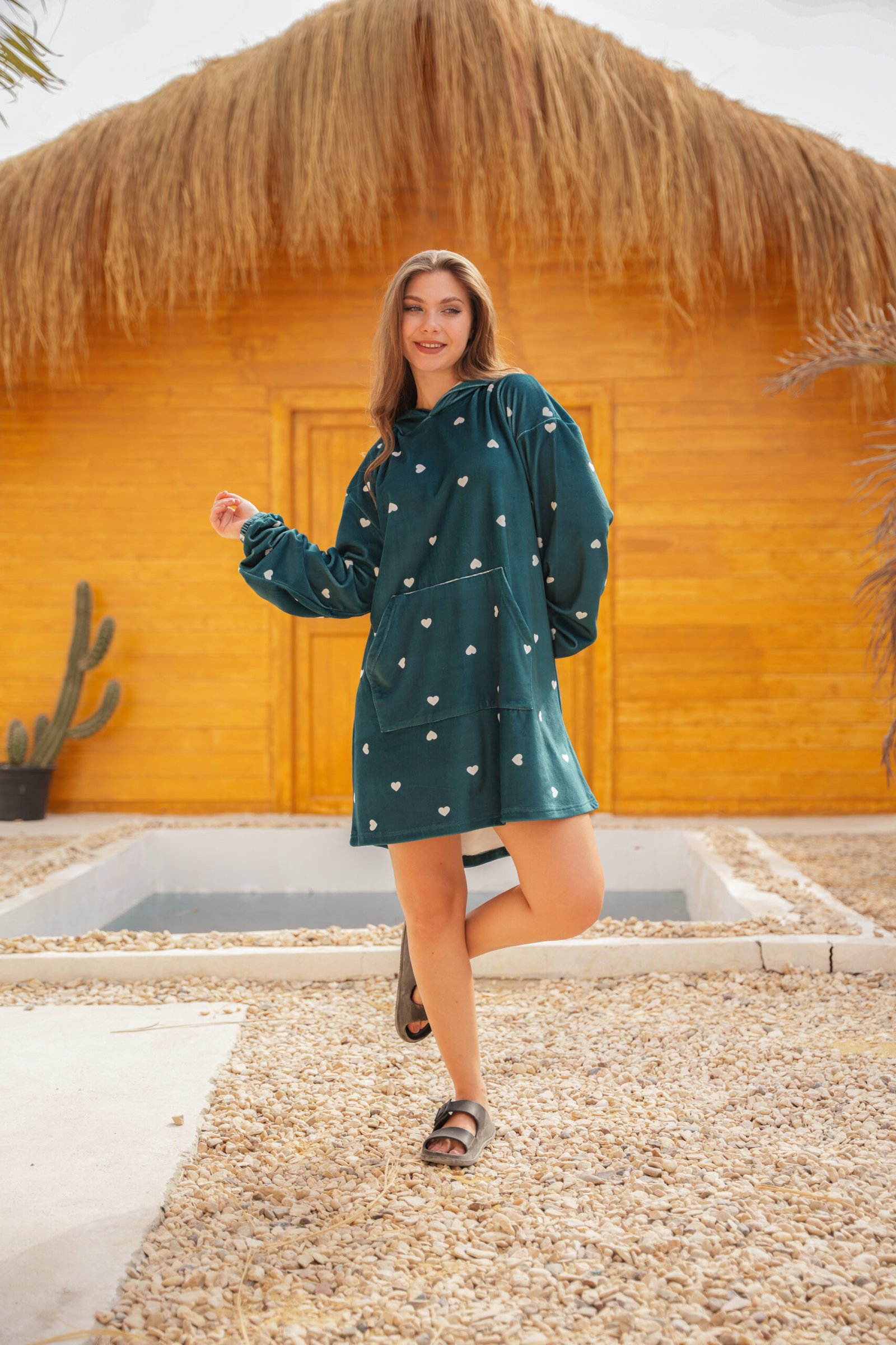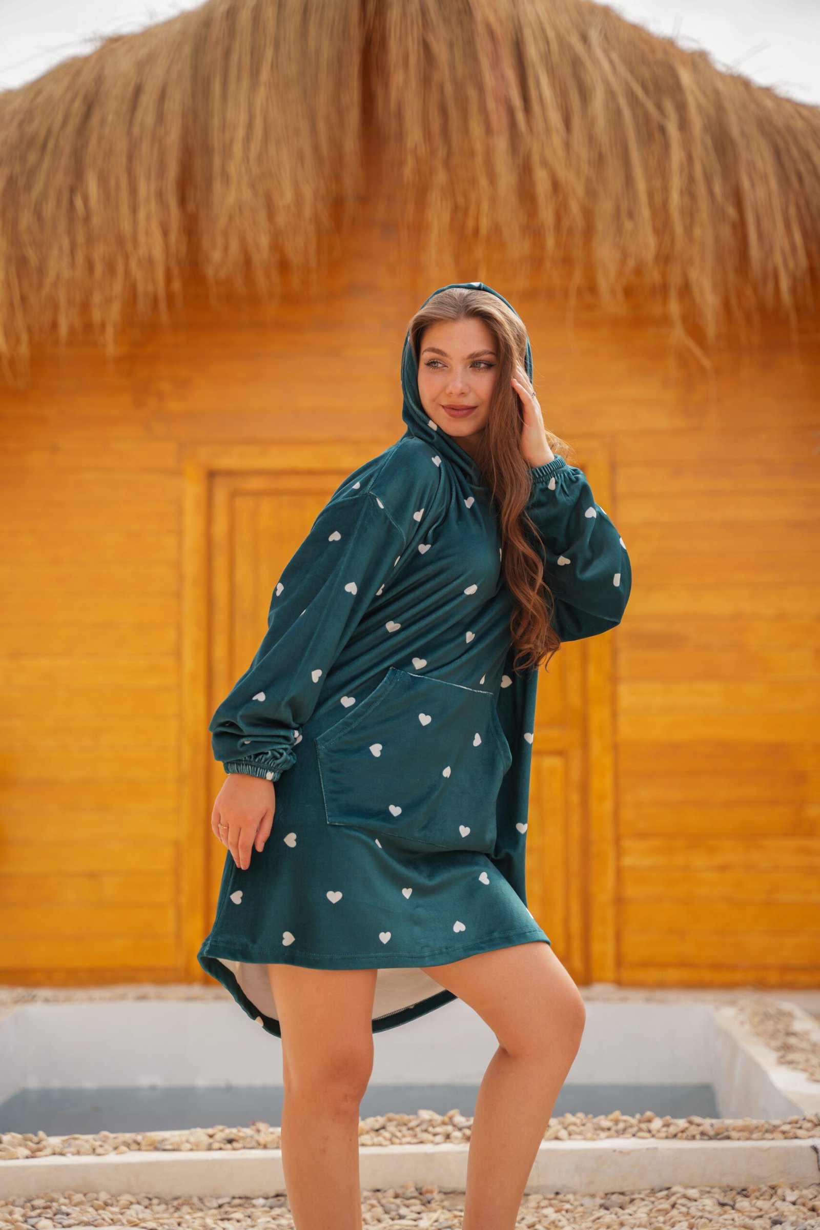 بلانكت هودي قطيفة مبطنة بستايل أوفر سايز واسع جداً ومريح، باللون الأخضر الداكن (Dark Green) مع نقشة قلوب صغيرة باللون الأبيض… شكل هادي، أنيق، وبناتي في نفس الوقت.