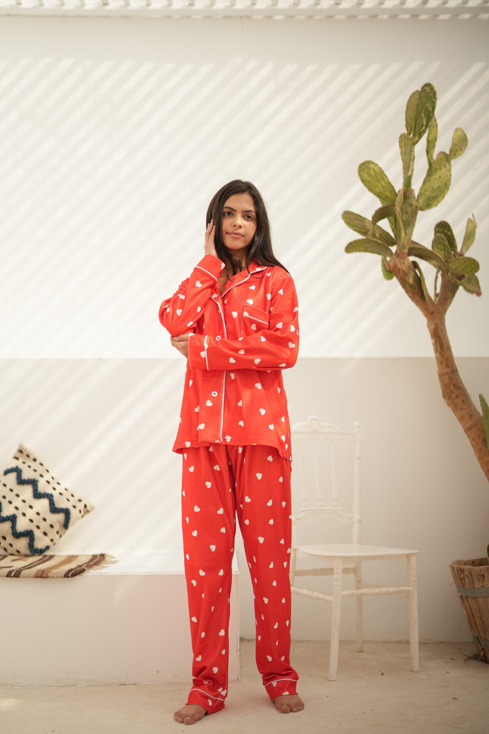 طقم قطيفة مضلّع بنقشة قلوب ناعمة، خامة دافئة ومريحة بستايل شبابي كيوت.