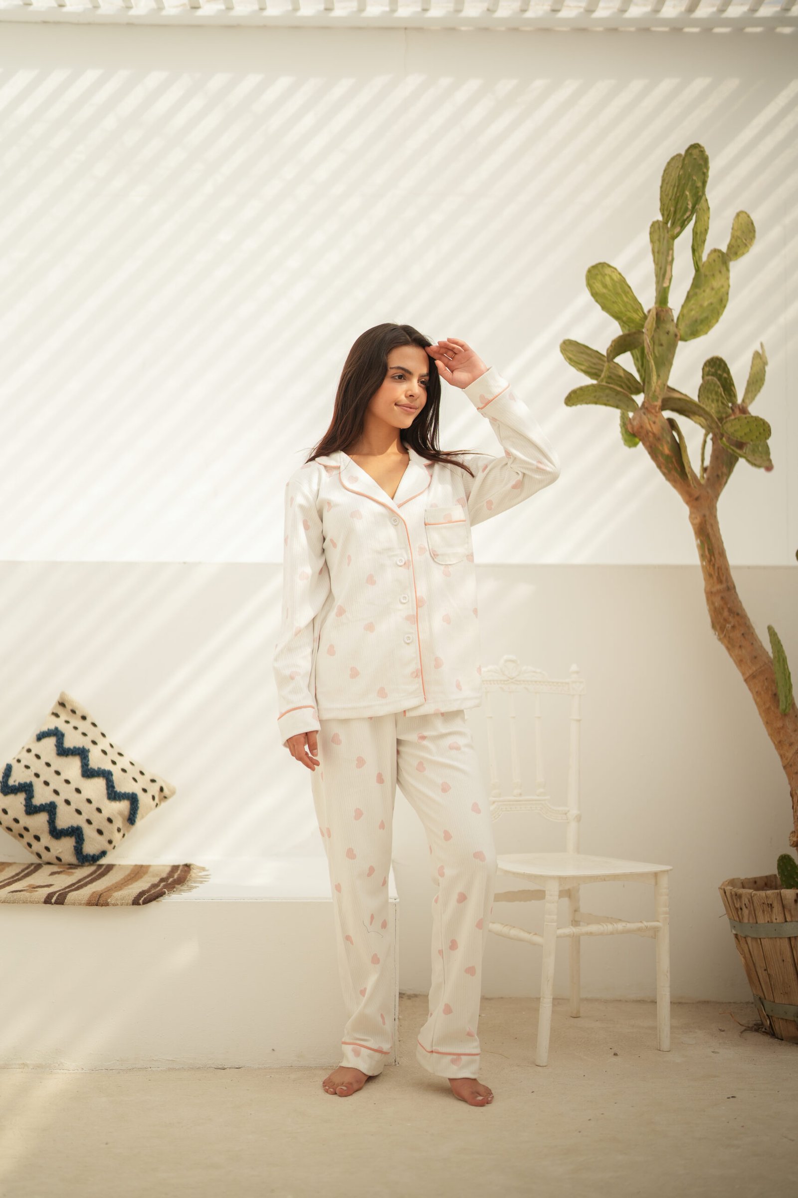 طقم قطيفة مضلّع بلون أوف وايت مزين بقلوب بينك ناعمة.