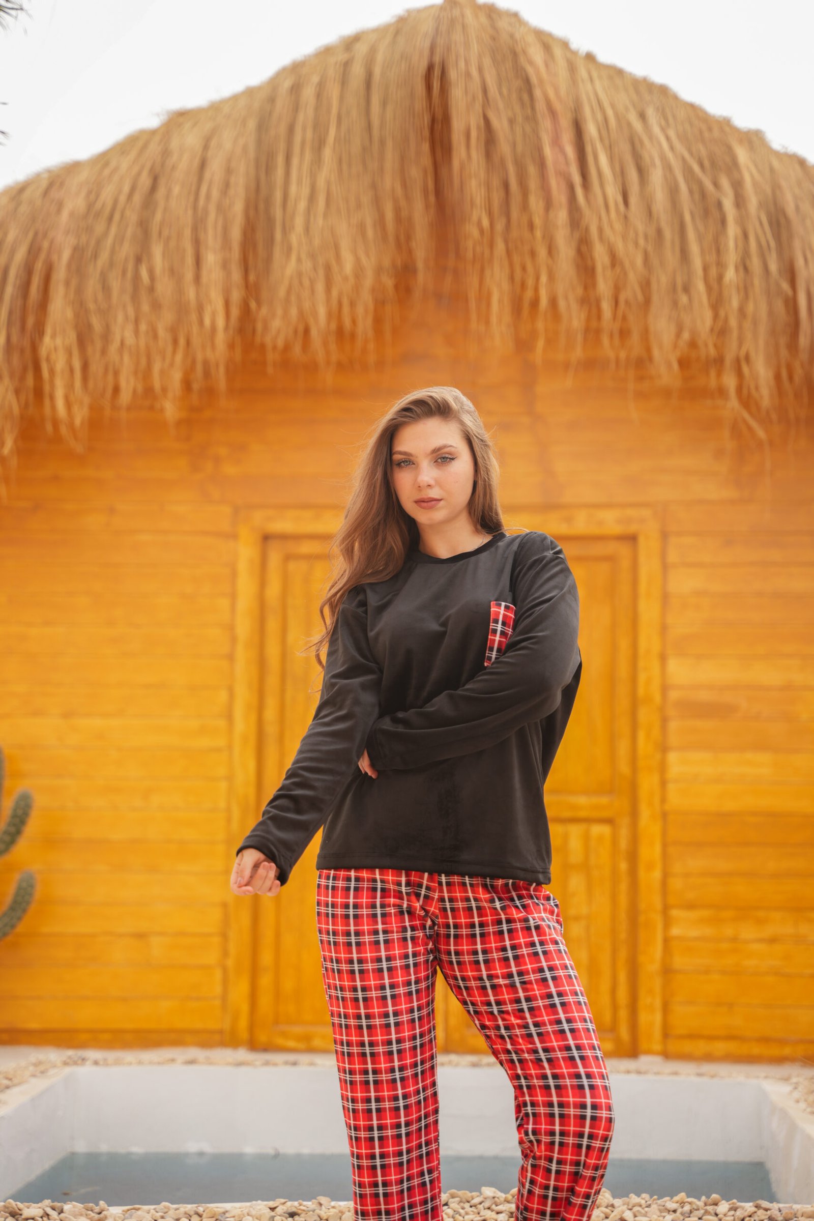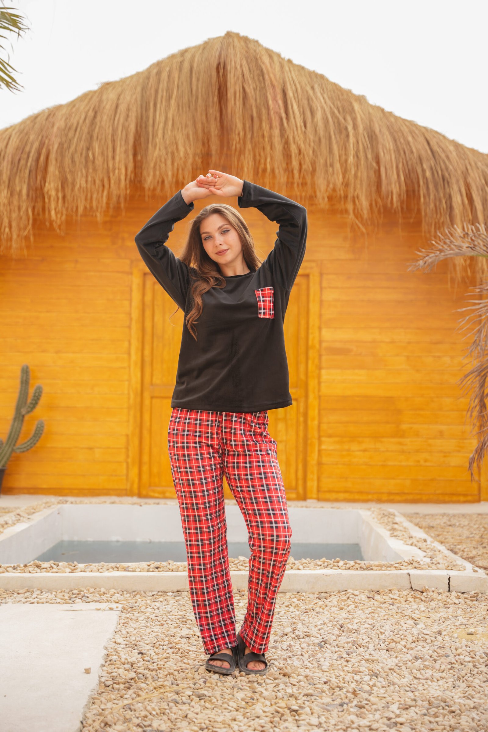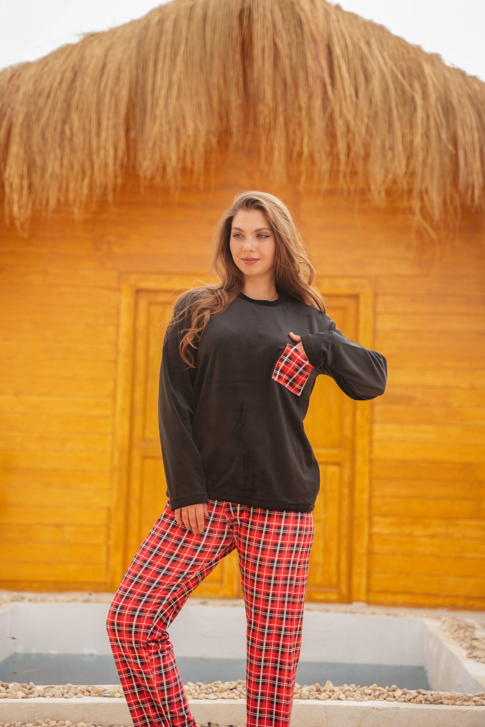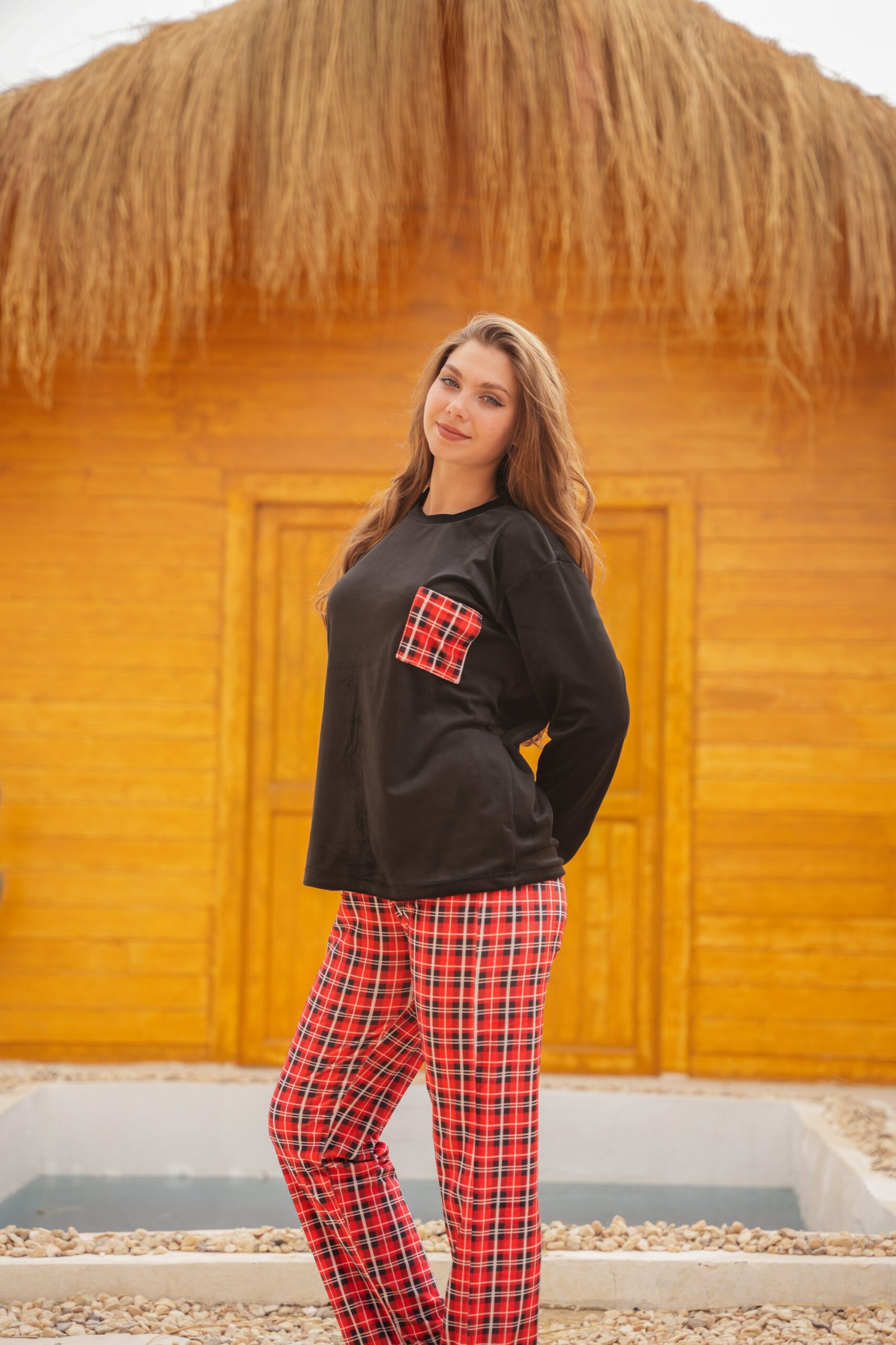 طقم شتوي قطيفة مبطن بجاكت أسود ناعم مع جيب كاروه مميز، وبنطلون كاروه أحمر ستايلش. مريح، دافئ، وعملي للبيت بلمسة شكل شيك وواضحة.