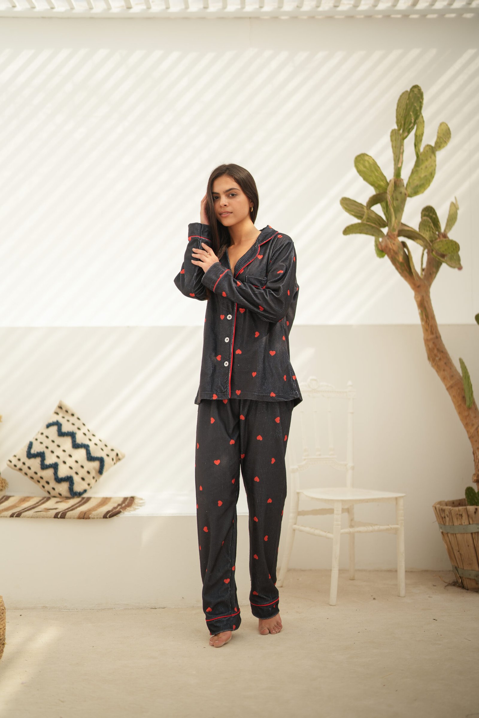طقم قطيفة مضلّع بنقشة قلوب حمرا ملفتة على لون أسود شيك.