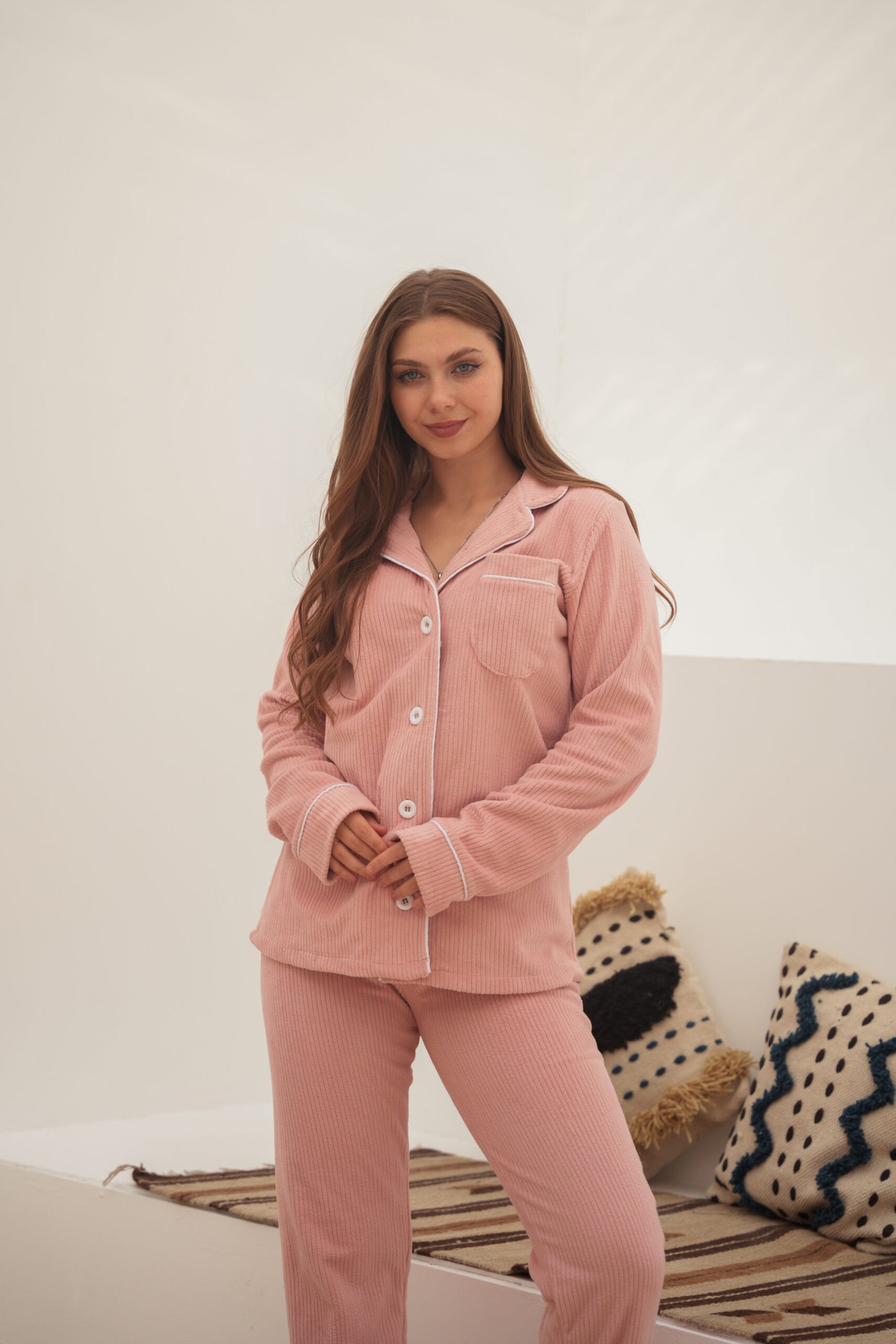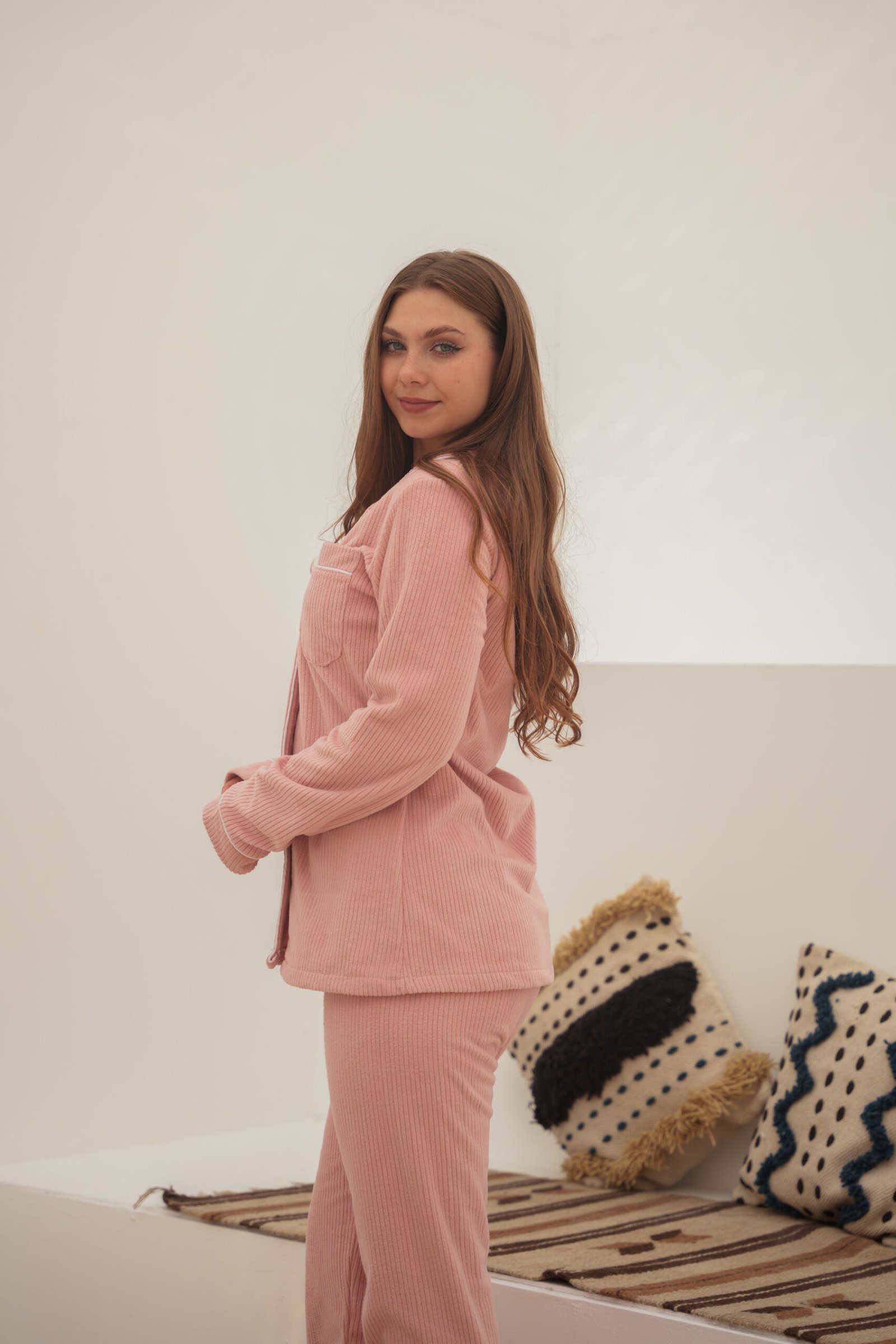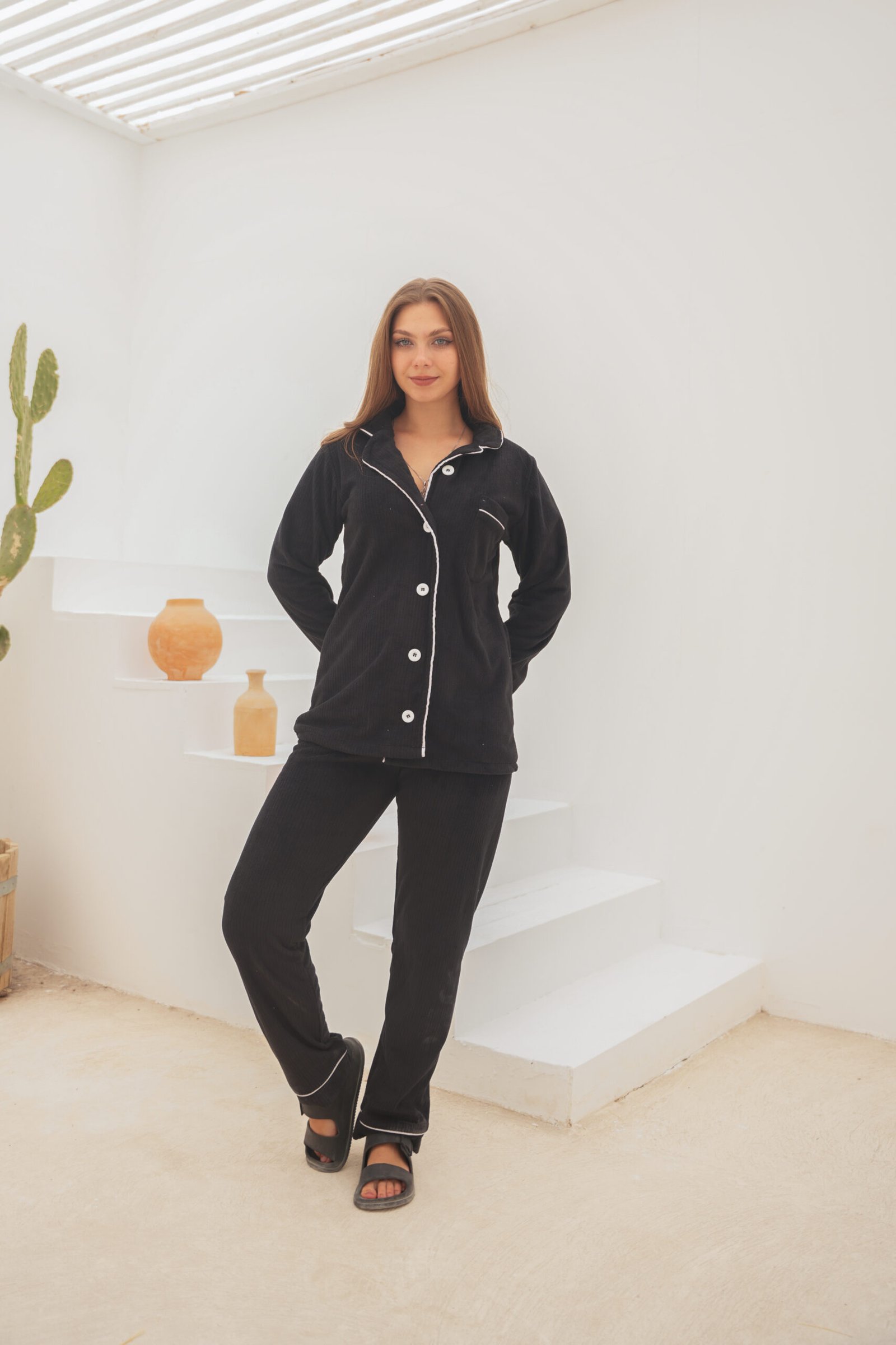 استمتعي بدفا ونعومة خيالية مع الـ Ribbed Velvet Cozy Set — طقم قطيفة مضلّع ناعم ومبطن، قصّة مريحة في اللبس، وخامة بتحتفظ بدفاها طول اليوم.