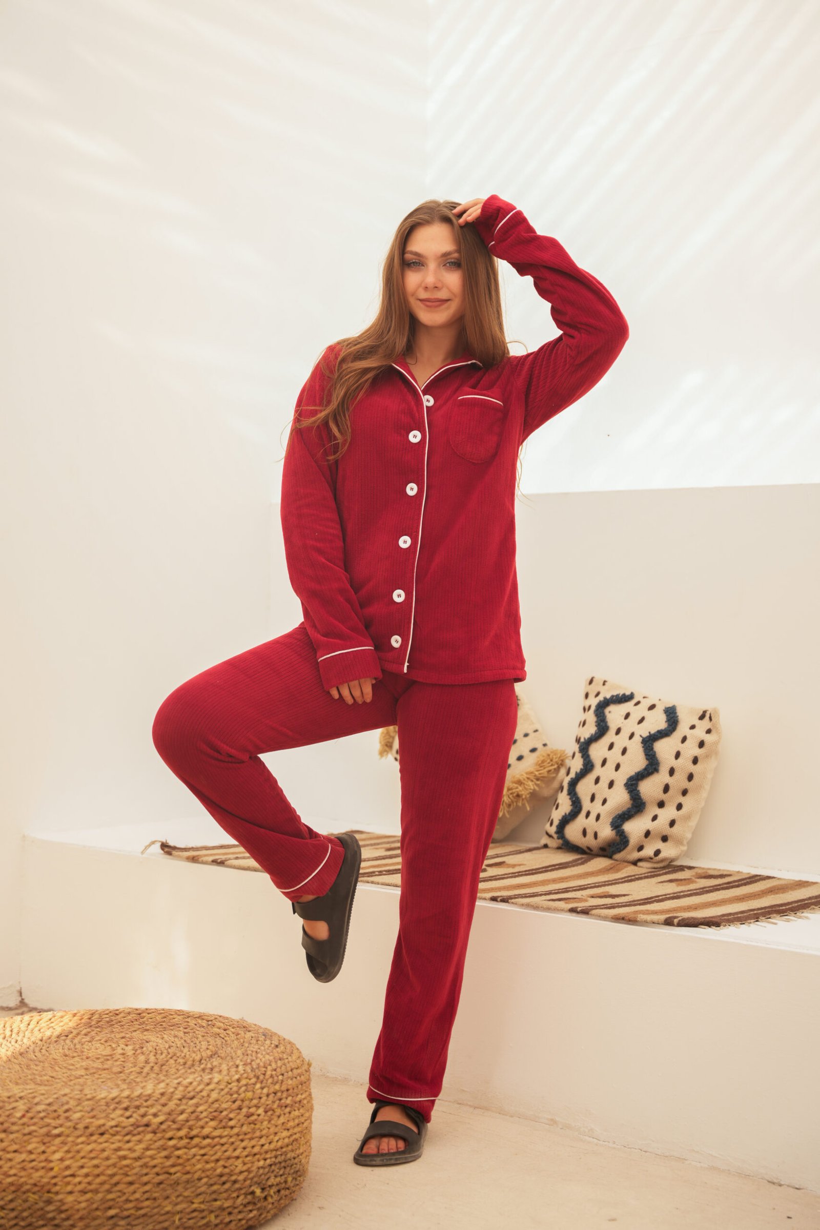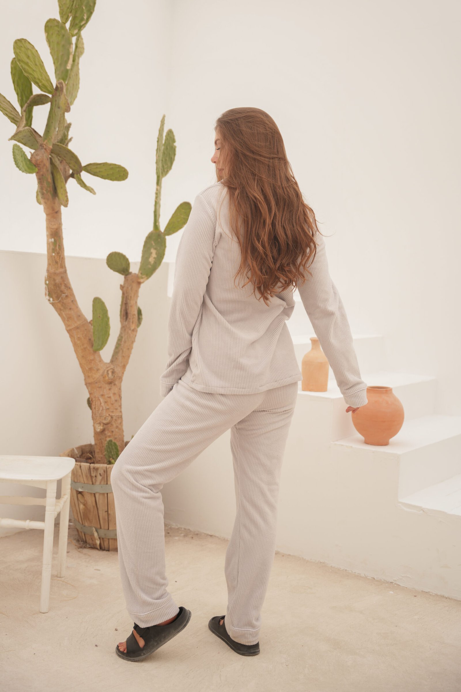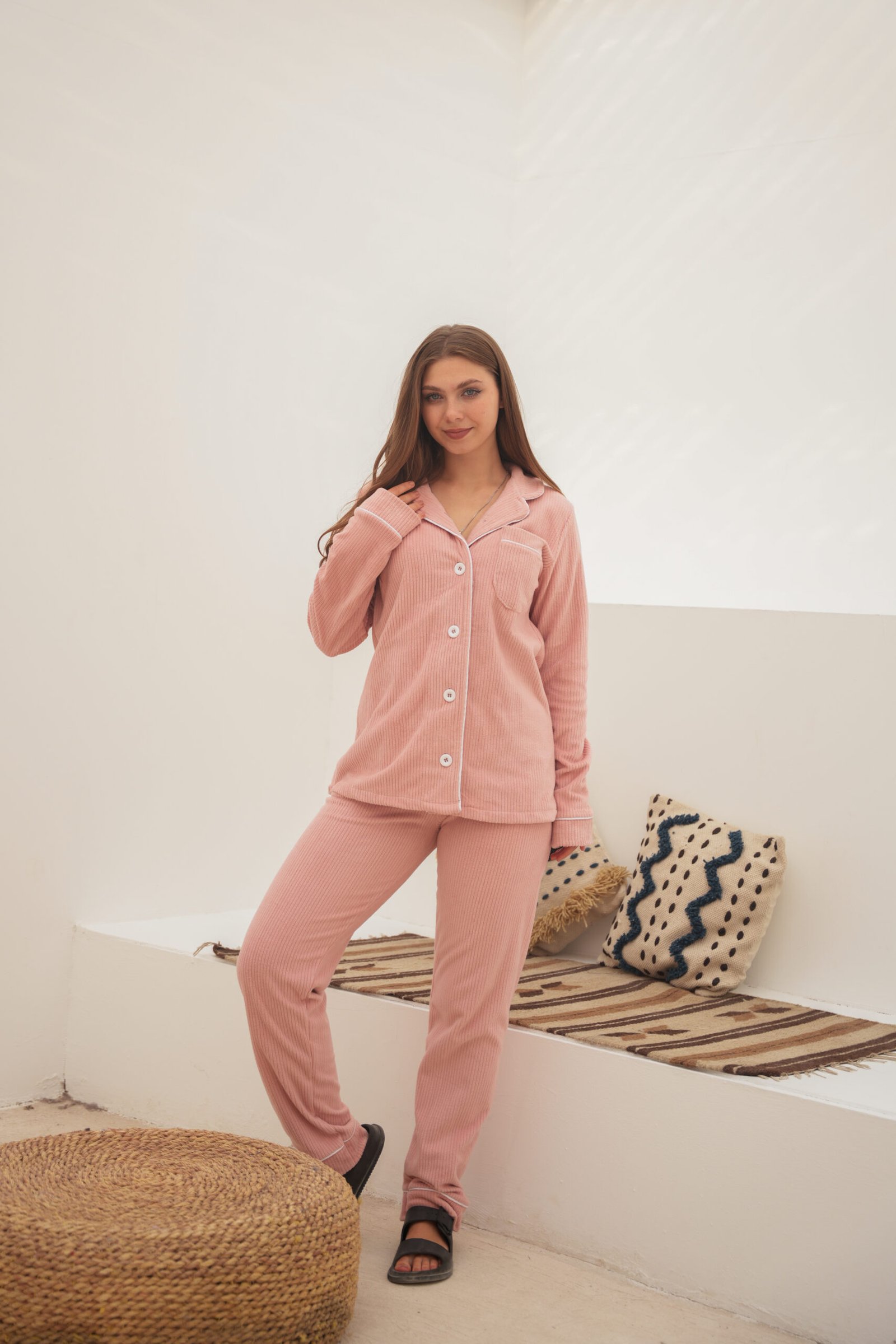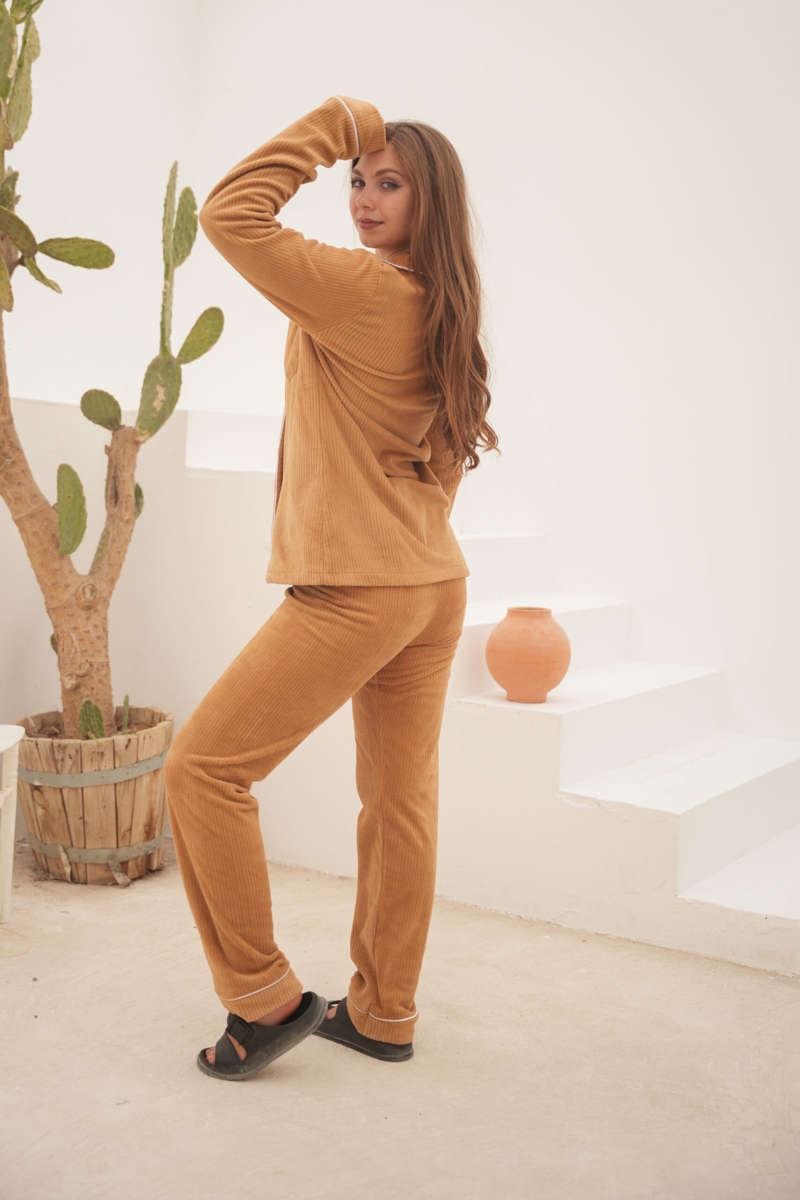 استمتعي بدفا ونعومة خيالية مع الـ Ribbed Velvet Cozy Set — طقم قطيفة مضلّع ناعم ومبطن، قصّة مريحة في اللبس، وخامة بتحتفظ بدفاها طول اليوم.