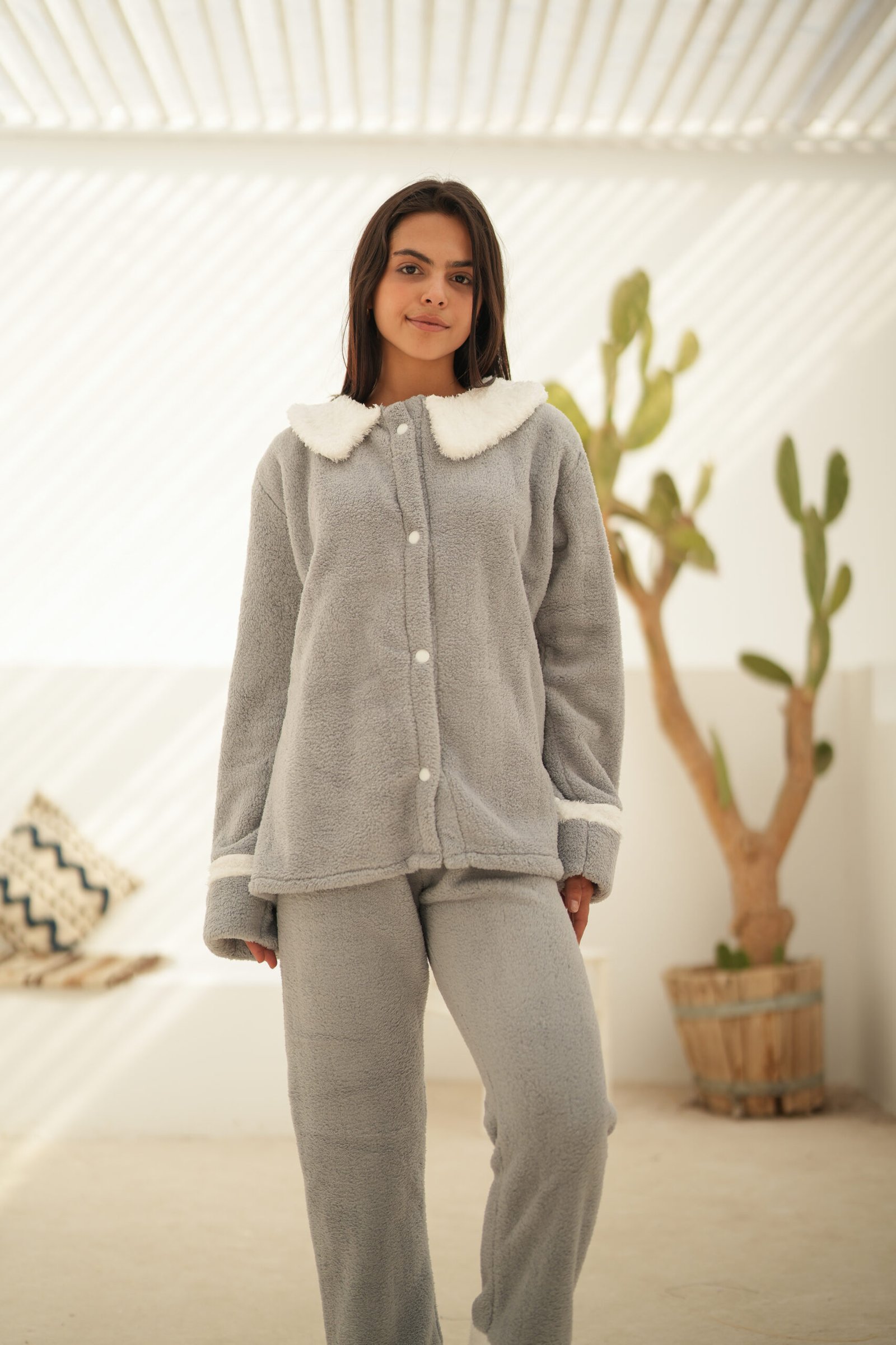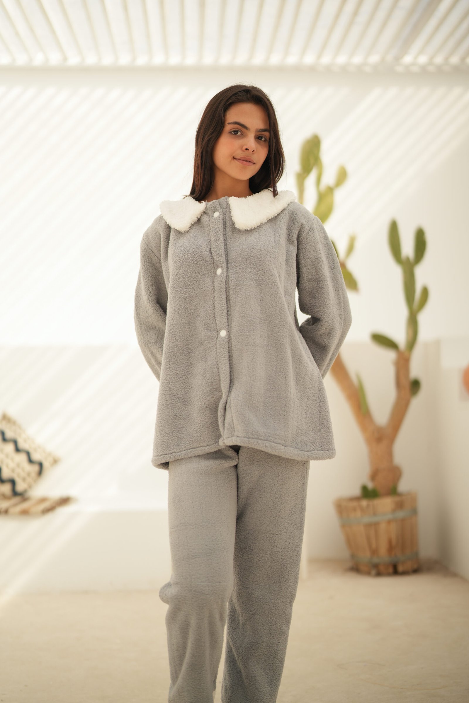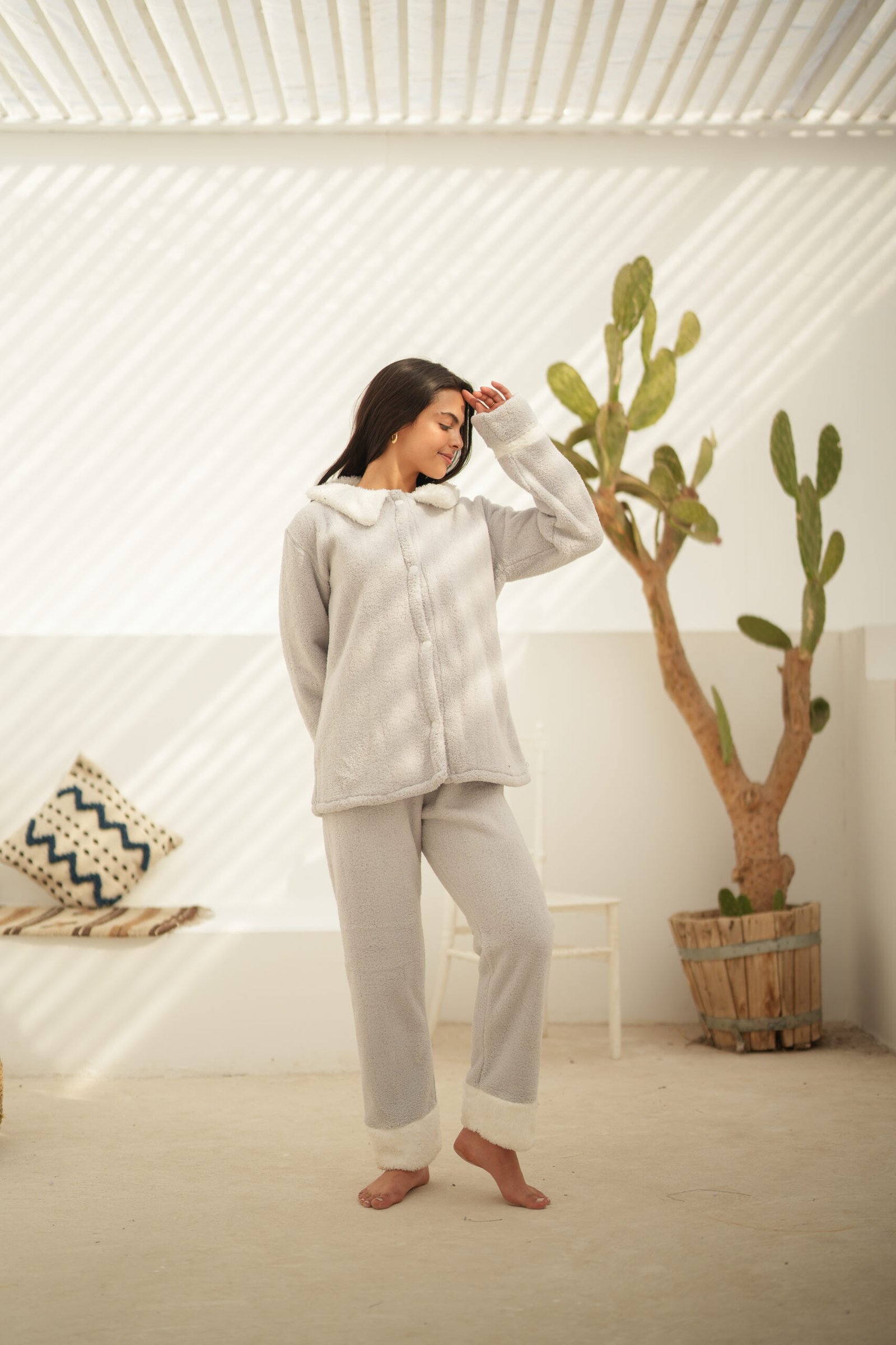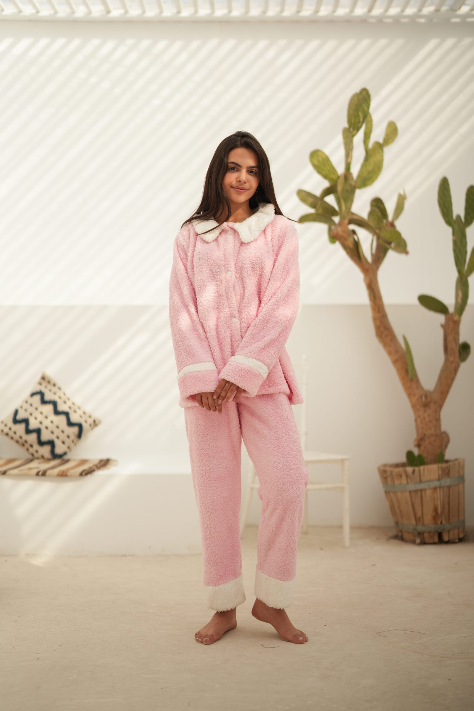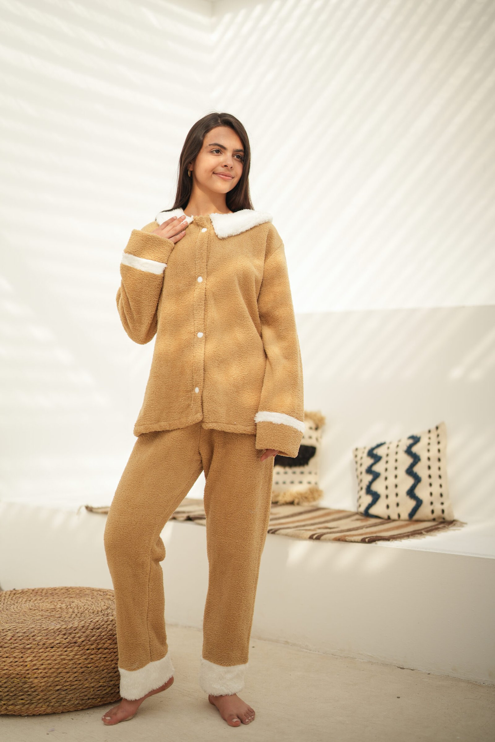 بيجامة شتوي ناعمة جدًا بخامة تيدي دافئة، جاكيت بزرار وياقة فرو مميزة مع بنطلون بنفس الستايل. مريحة، تقيلة في الدفا، وشكلها شيك في اللبس. متوفرة بـ 10 ألوان.