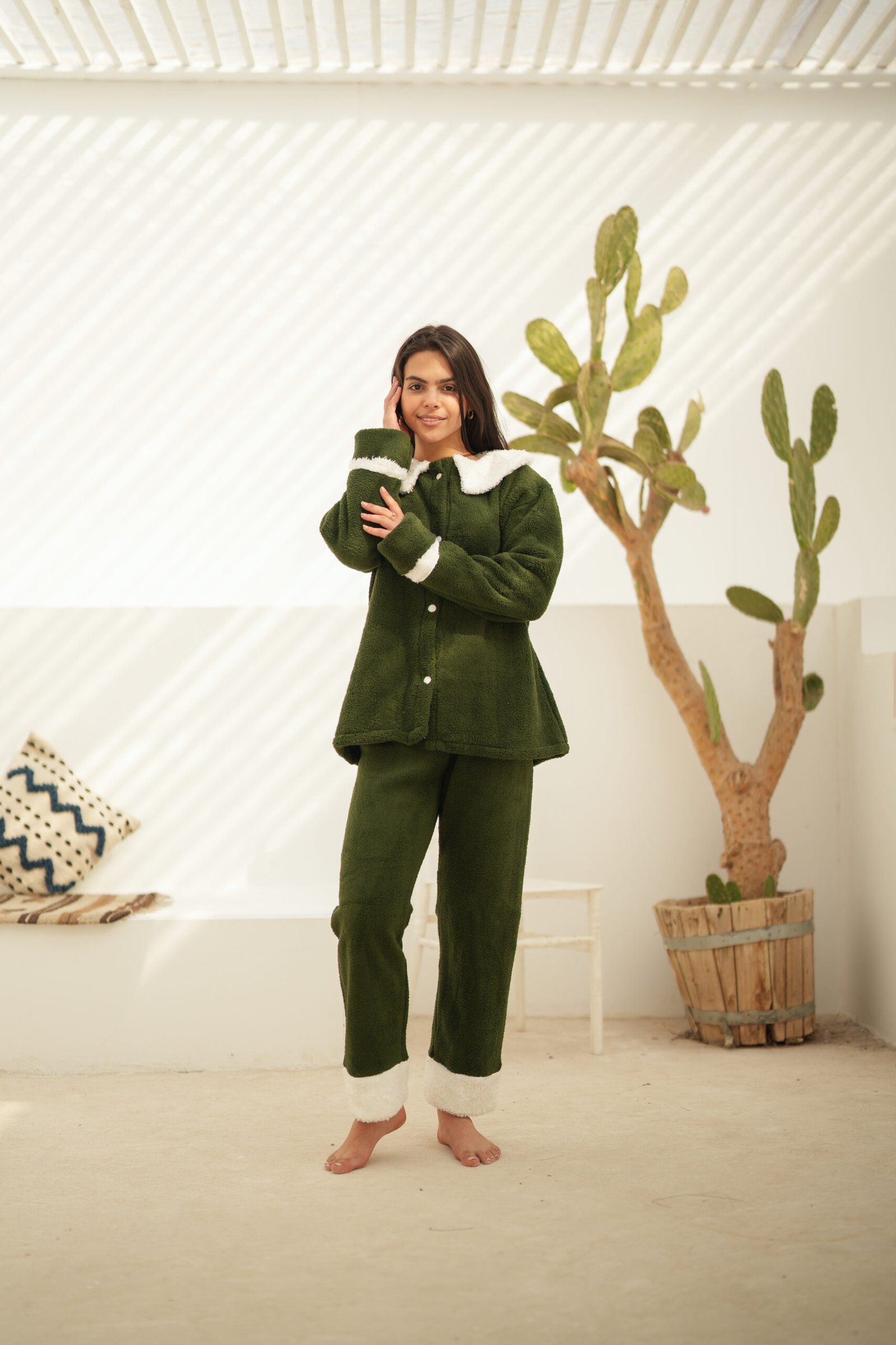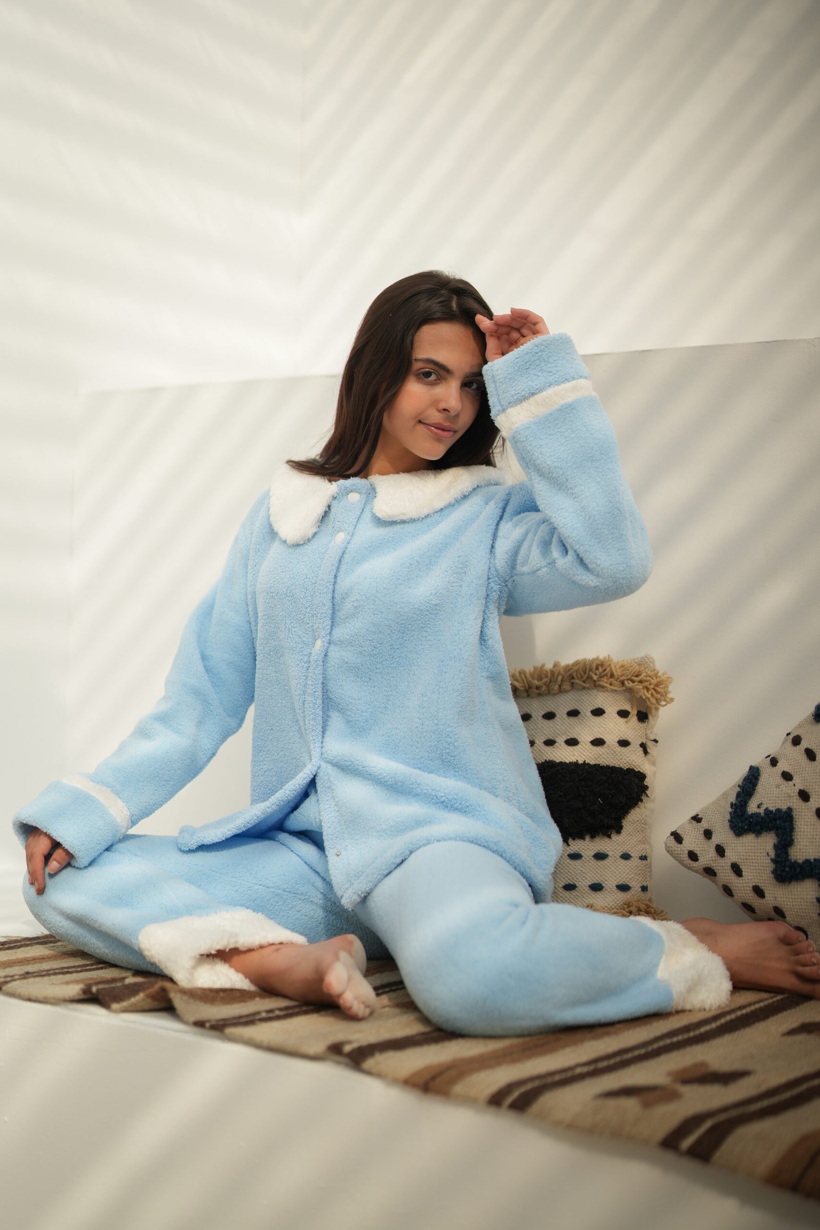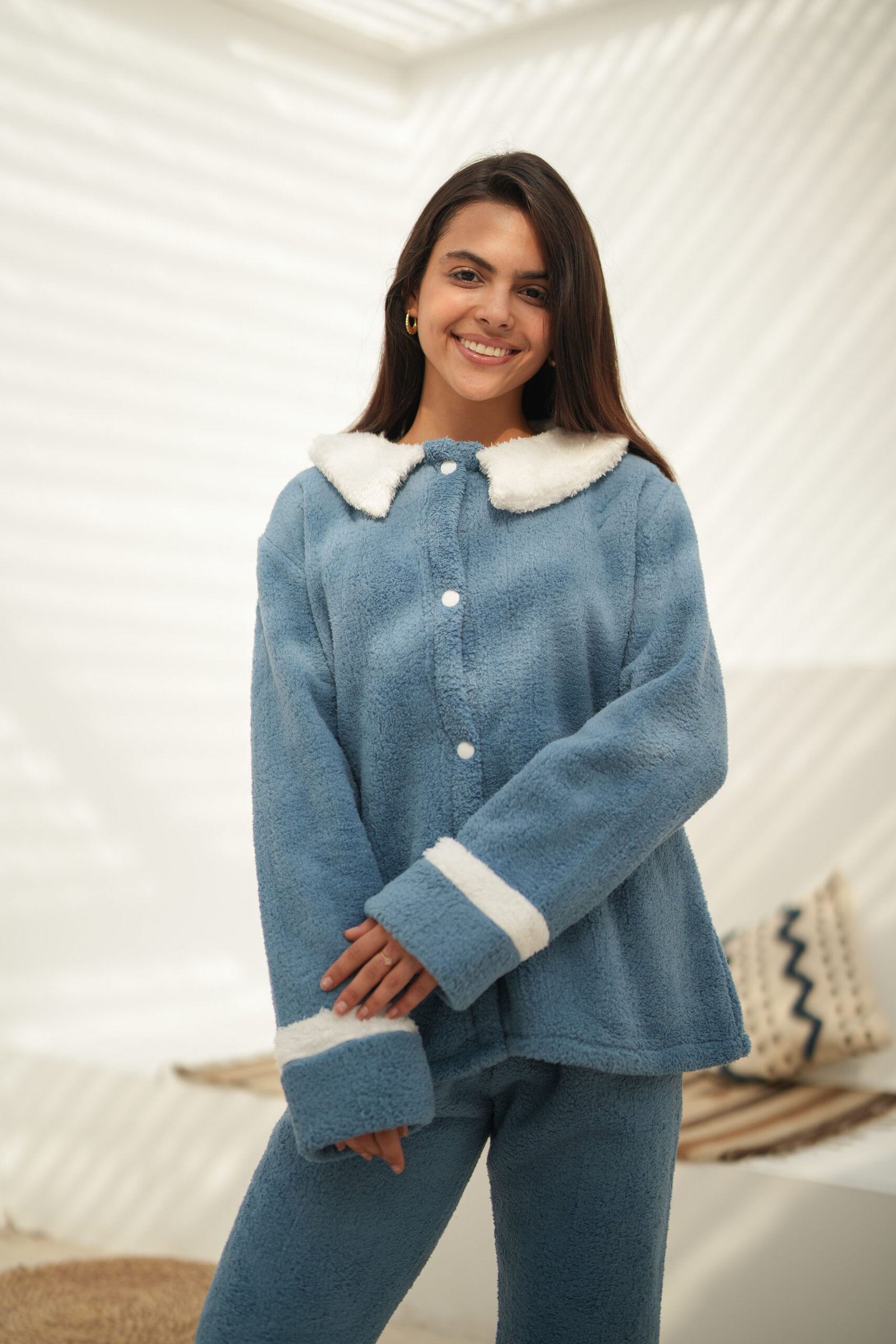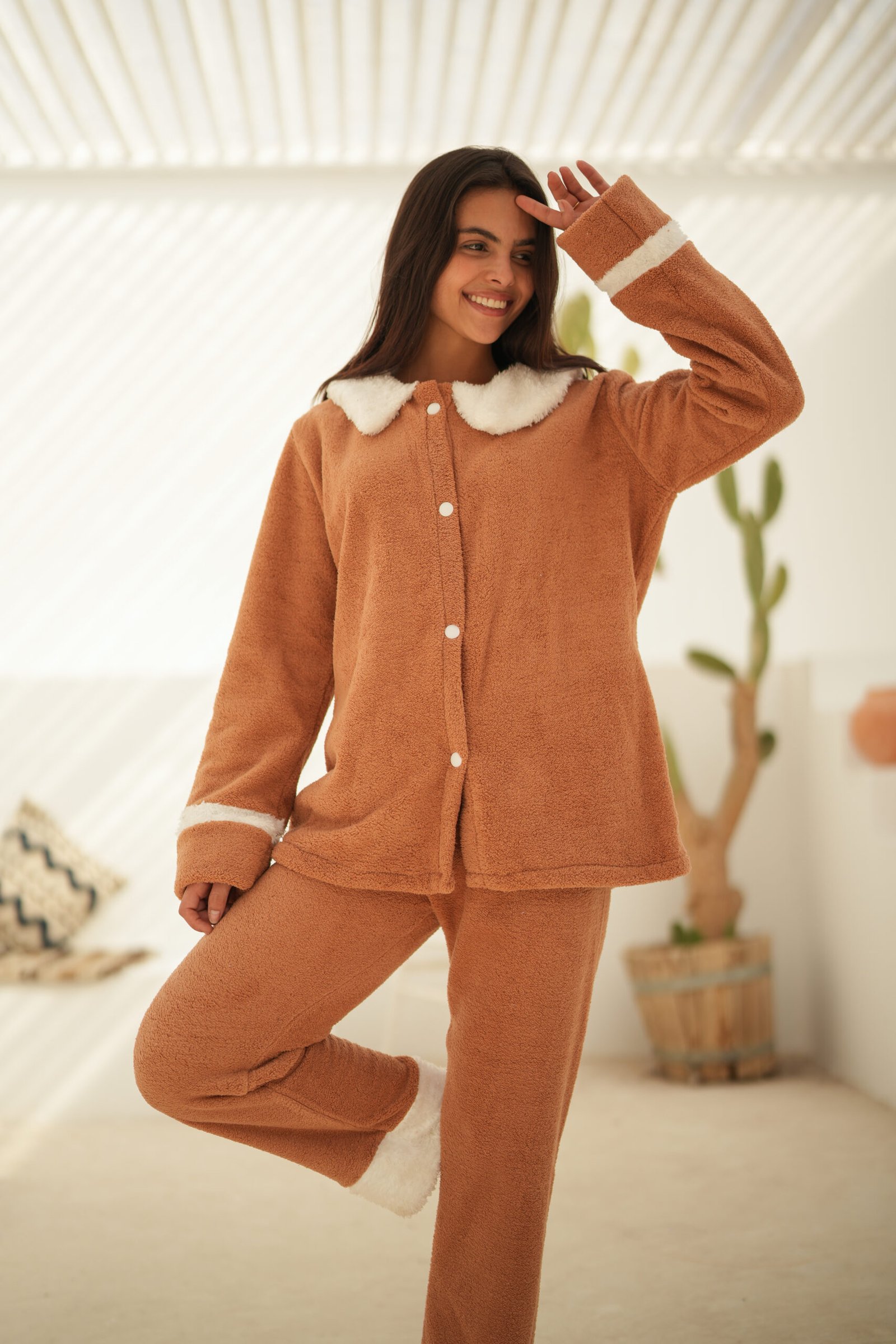 بيجامة شتوي ناعمة جدًا بخامة تيدي دافئة، جاكيت بزرار وياقة فرو مميزة مع بنطلون بنفس الستايل. مريحة، تقيلة في الدفا، وشكلها شيك في اللبس. متوفرة بـ 10 ألوان.