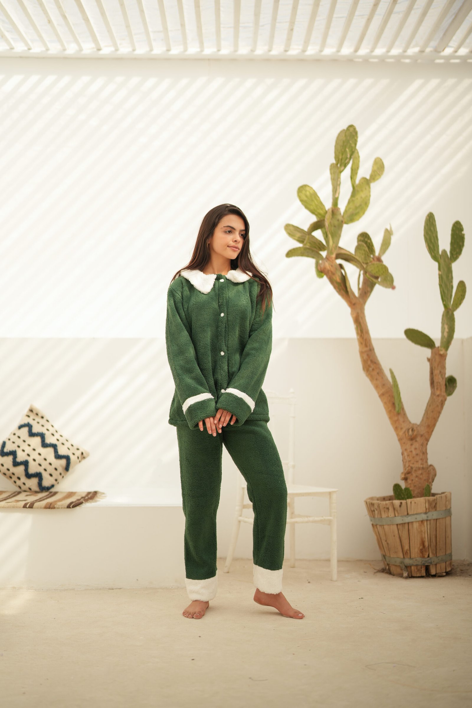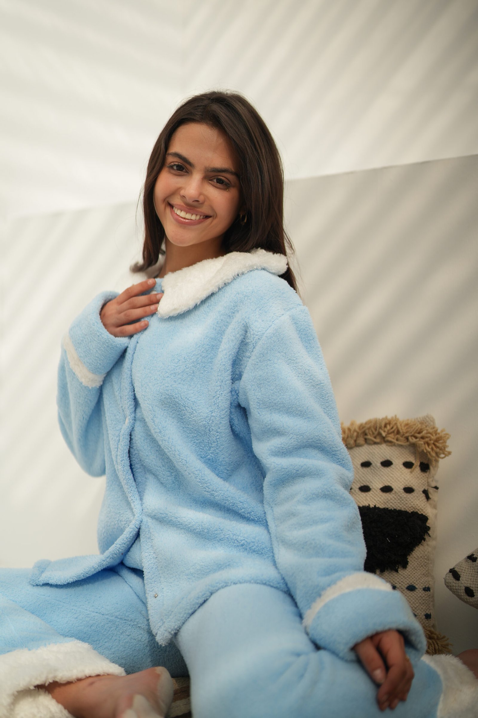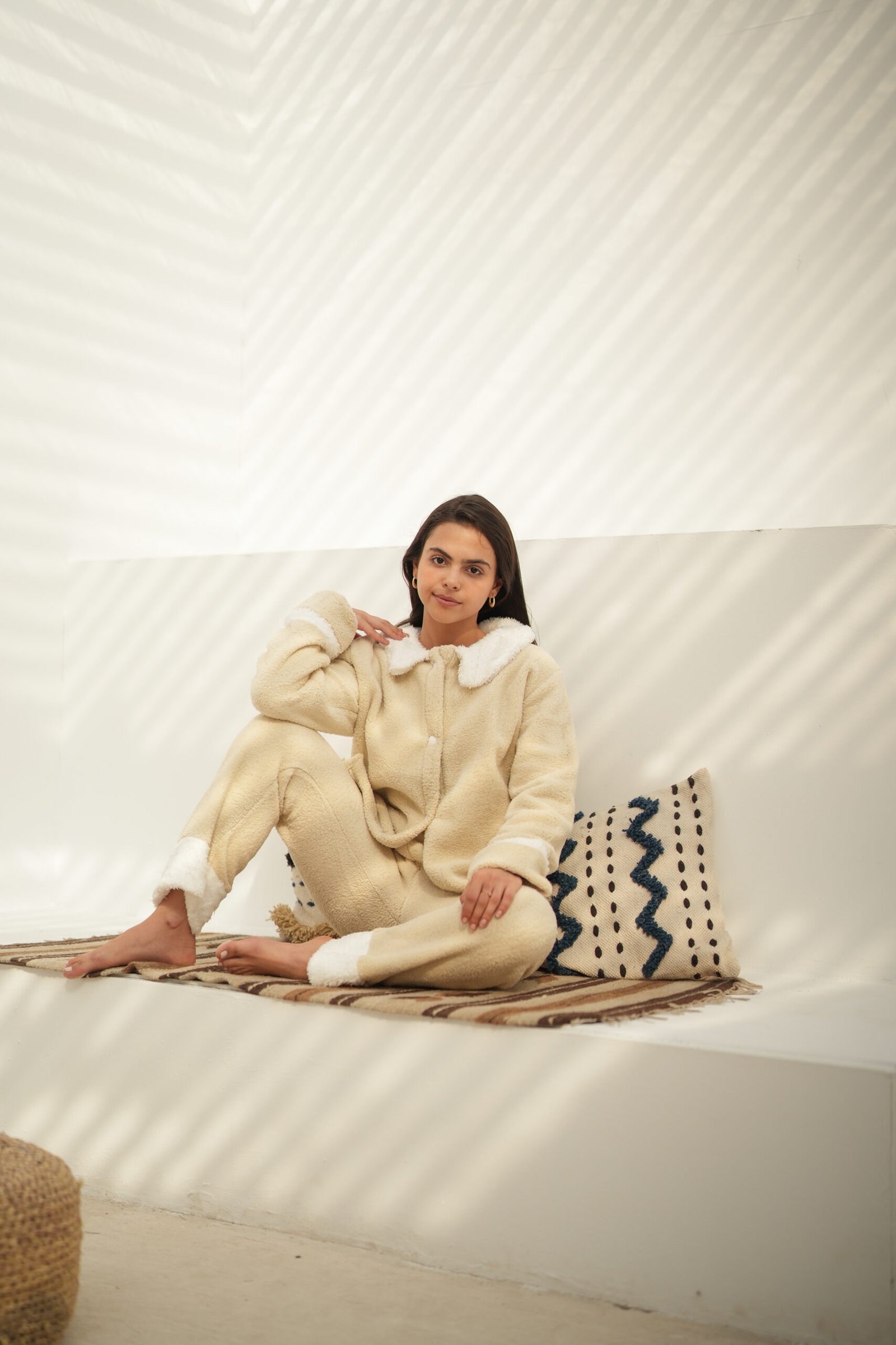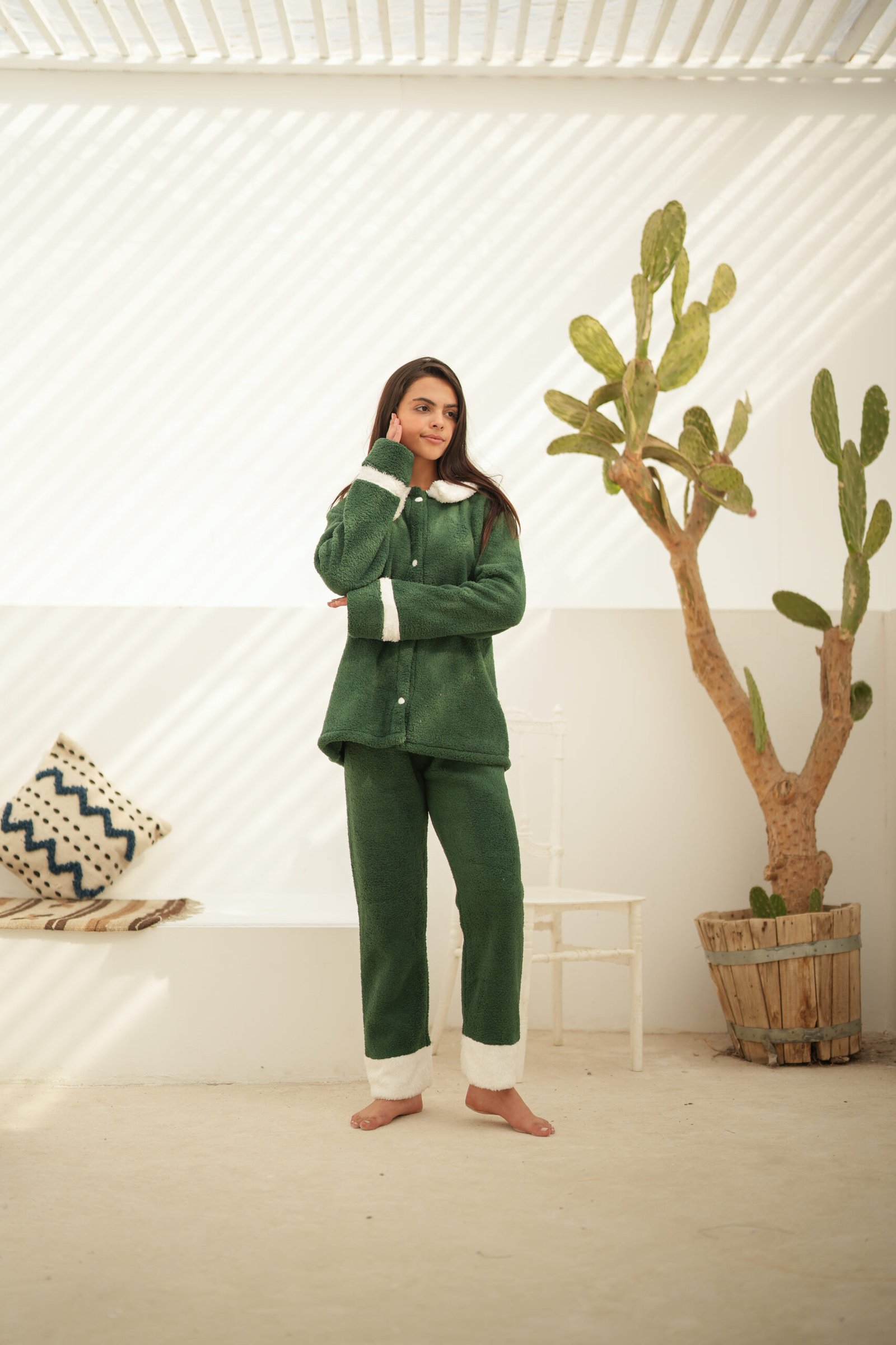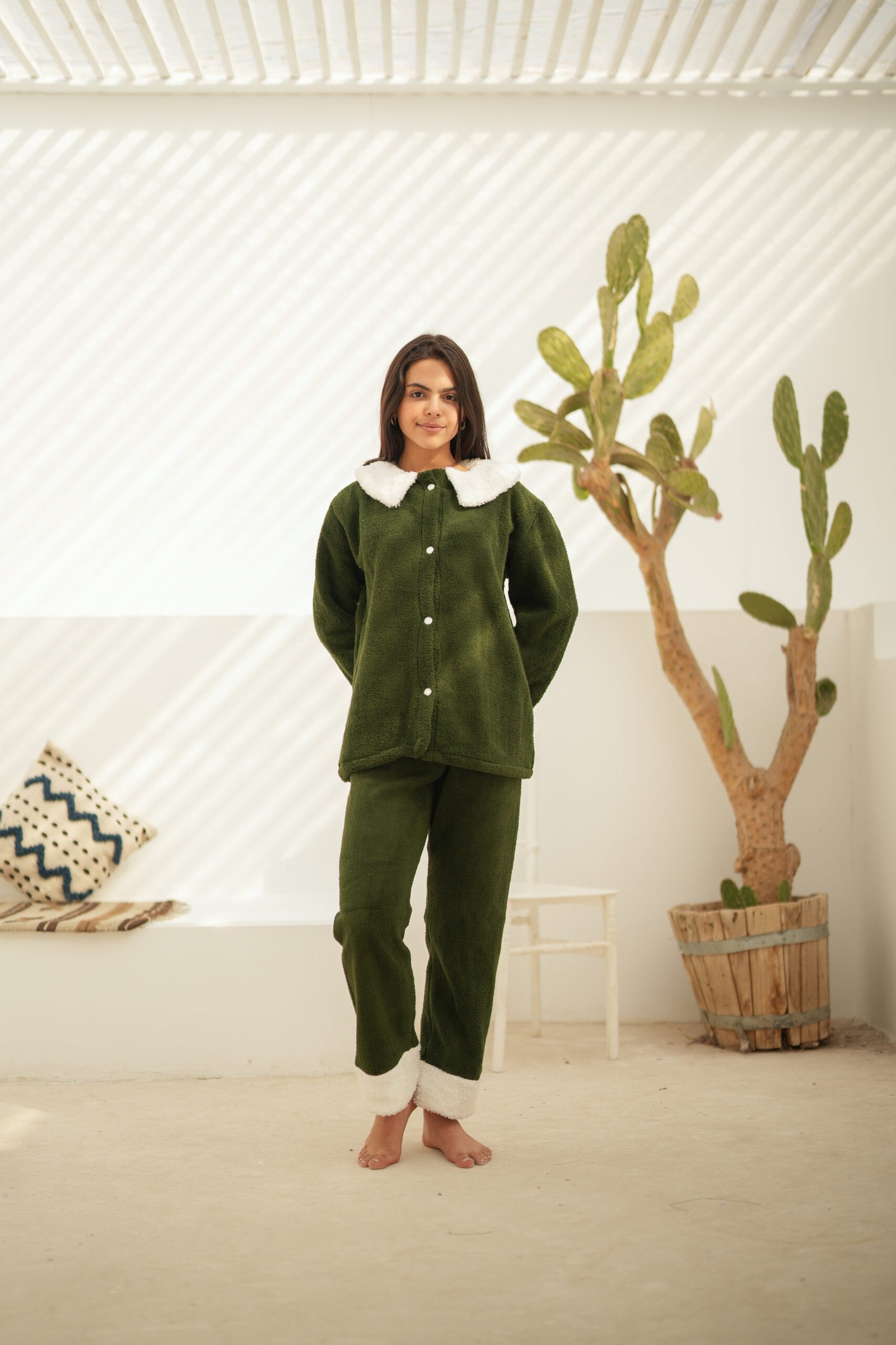 بيجامة شتوي ناعمة جدًا بخامة تيدي دافئة، جاكيت بزرار وياقة فرو مميزة مع بنطلون بنفس الستايل. مريحة، تقيلة في الدفا، وشكلها شيك في اللبس. متوفرة بـ 10 ألوان.